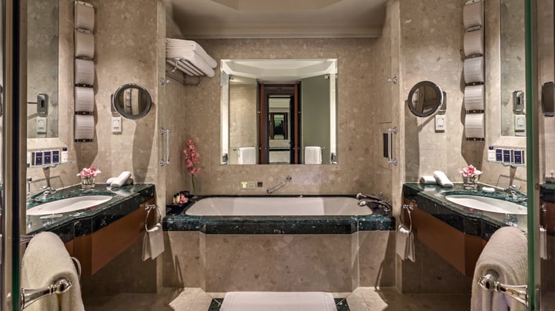 For our part we stayed in a Deluxe Suite for two nights - its 74 m2 are divided between a living room with dining table, a large separate bedroom, a dressing room and a bathroom fashioned from marble. Luxurious touches of silk, antiques, and wood paneling work together to create a warm, refined elegance.