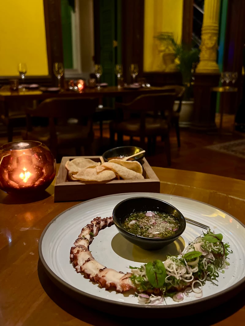 In a bolder register, the Larb Nhuad Pla Mhuek Yak Yang showcased a charcoal-grilled Spanish octopus tentacle, arranged in a half-circle alongside a larb salad with mint, fresh herbs and young shoots. An intense, fragrant sauce at the center of the plate elevated the whole, for a vibrant, graphic and perfectly executed starter.