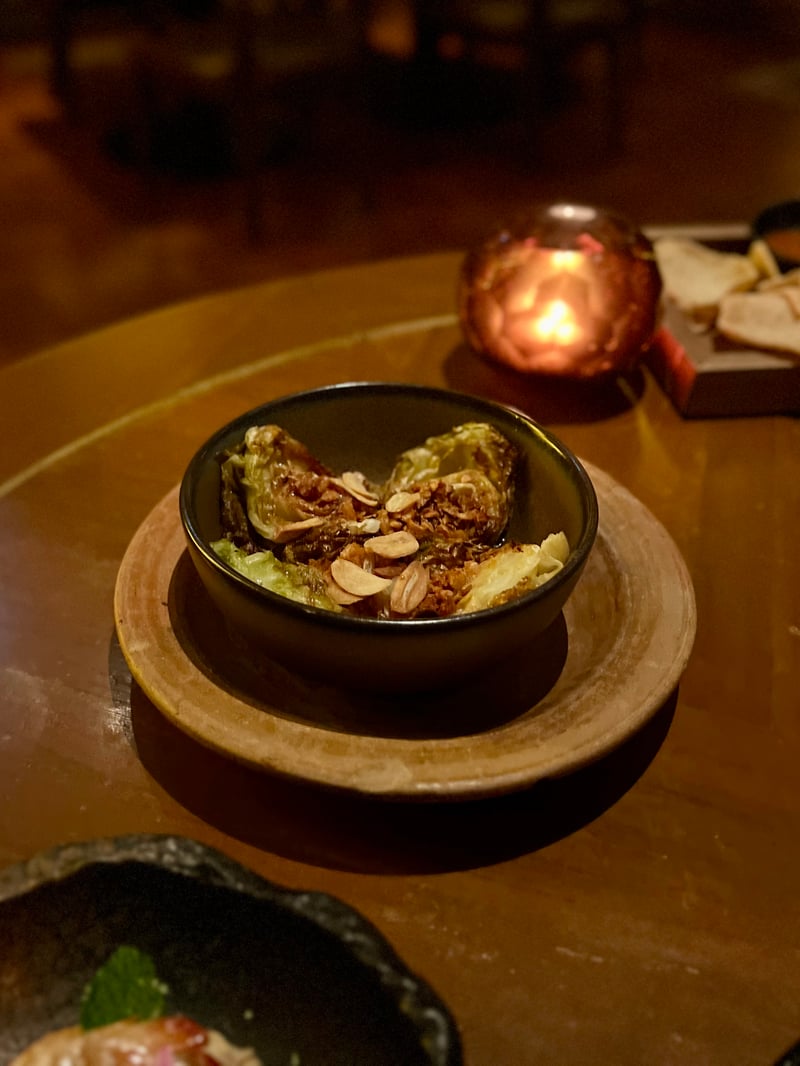 More understated but equally memorable, the Ka Lam Plee Ob Nam Pla revisited cabbage with mastery. Roasted to achieve a meltingly tender, caramelized texture, it was glazed with a rich, umami-laden fish sauce reduction, then topped with fried onions and nuts for a perfectly balanced contrast of textures. A minimalist dish in appearance, but with astonishing depth of flavor.