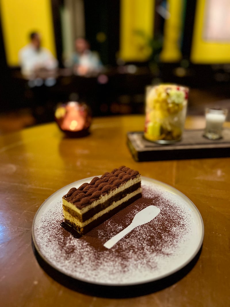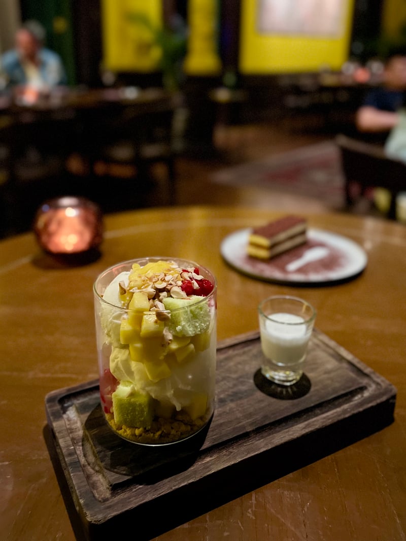 To close the meal on a sweet note, two desserts perfectly illustrated the house's creative spirit. The Thai Tea–ramisu, an elegant nod to Italian tiramisu, alternated layers of silky mascarpone and biscuit soaked in Thai tea, all dusted with cocoa featuring a spoon motif drawn in negative — a visual as much as gustatory delight. Beside it, the Coconut Sundae with Tubtim Krob offered an explosion of freshness and textures: water chestnut pearls, juicy mango, pandan sponge cake, coconut ice cream and shortbread crumble, to be drizzled with a delicate sweetened coconut milk. A finale as playful as it was enchanting, true to Paii's bold and sensory spirit.