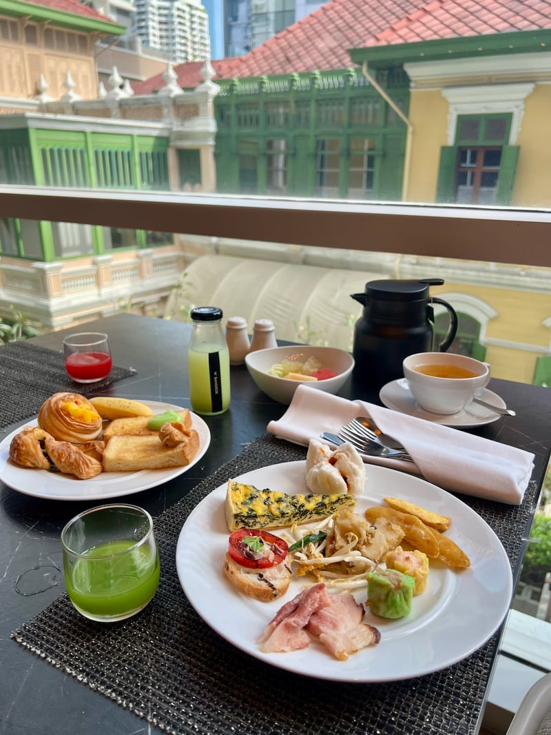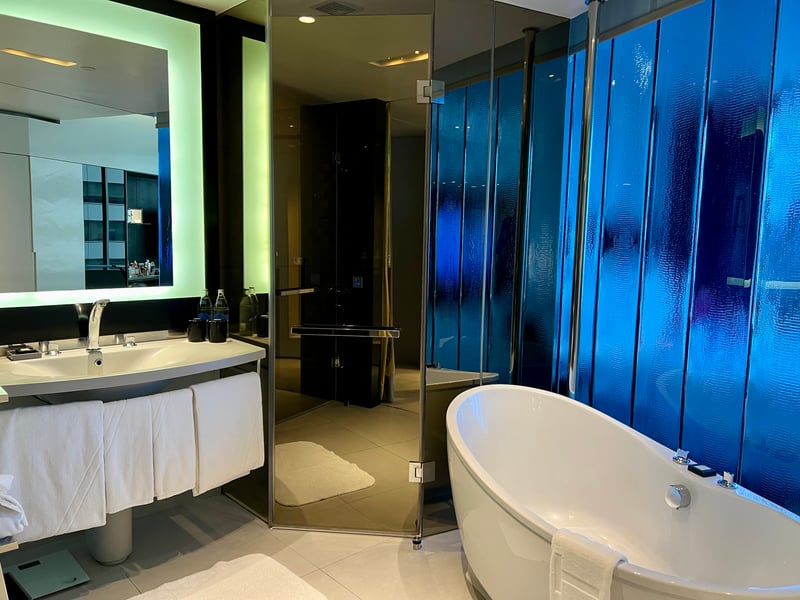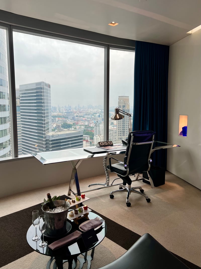 We stayed in a 43 m² Deluxe Room, at once spacious, bright and meticulously arranged. The atmosphere is warm, enveloping and resolutely design-forward: backlit silhouettes projected onto the colored walls create a captivating play of shadows that transforms the space throughout the day. The elegant, minimalist bathroom, equipped with a bathtub, extends this sense of refined well-being. And thanks to the floor-to-ceiling windows, Bangkok's ever-changing skyline enters the room, offering a striking contrast between the exterior bustle and interior serenity.