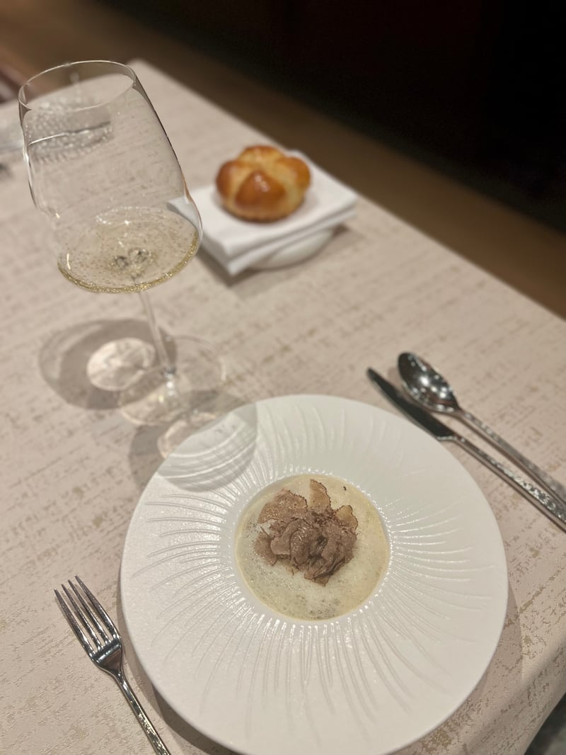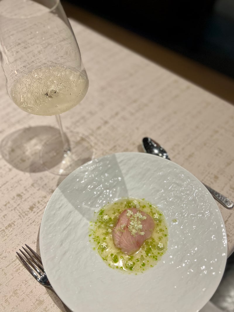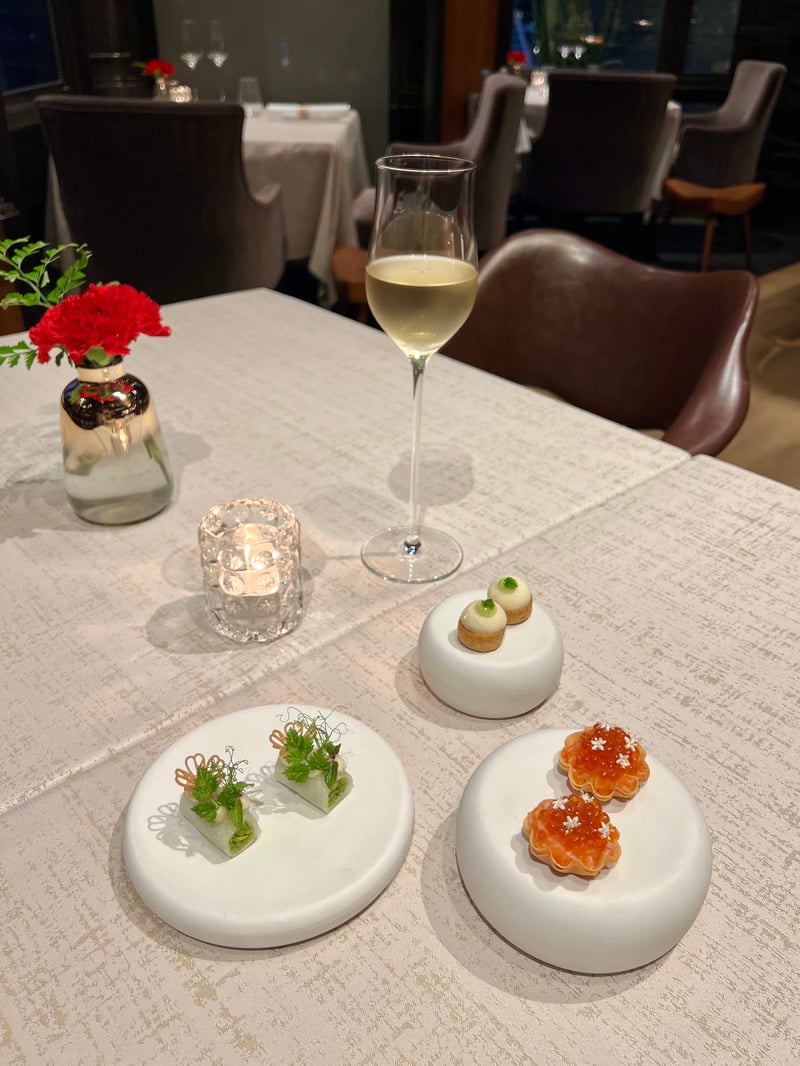 The dinner begins with a series of amuse-bouches that aptly illustrate the Franco-Japanese alliance at the heart of the chef's cuisine. From the very first bites, the technical precision and balance of flavors set the tone for the experience to come, all accompanied by a glass of Ruinart champagne.