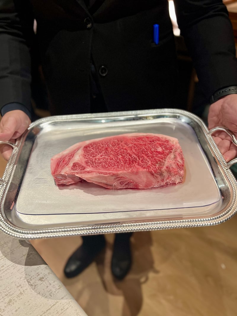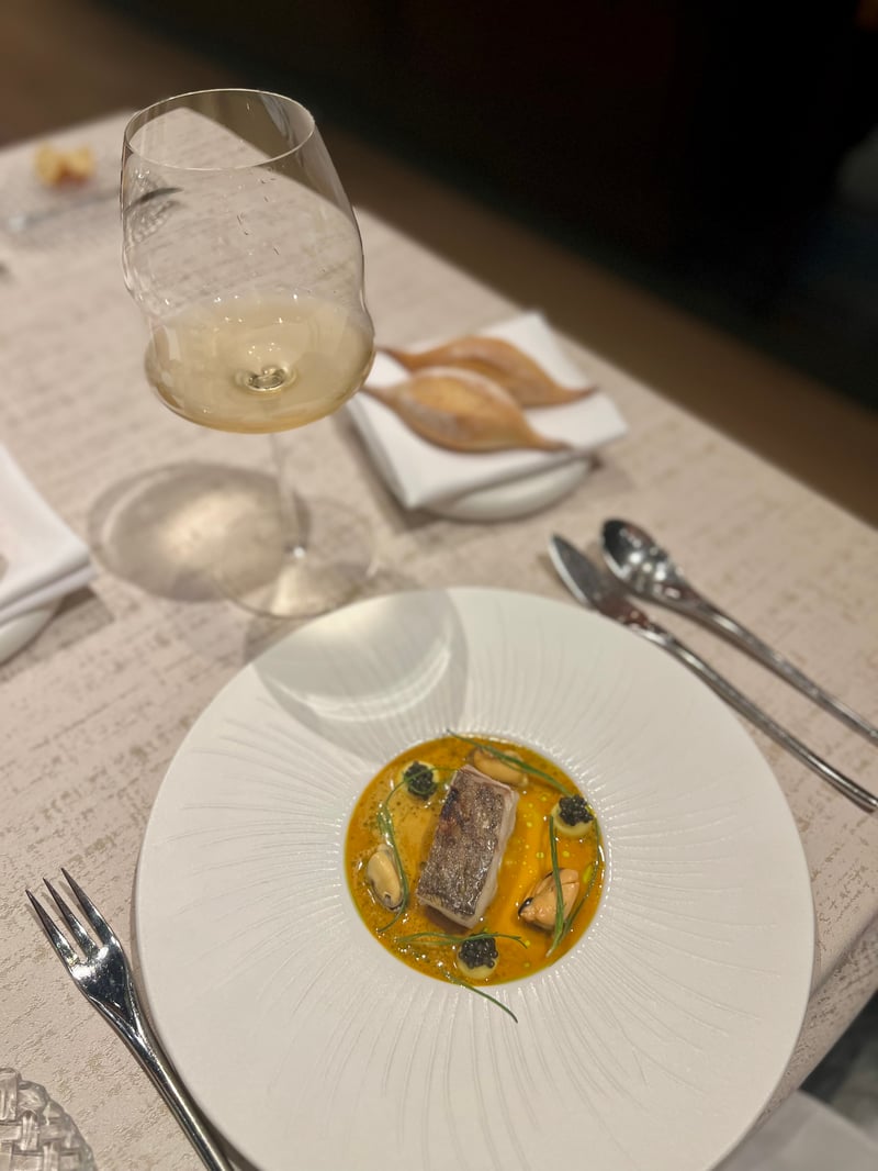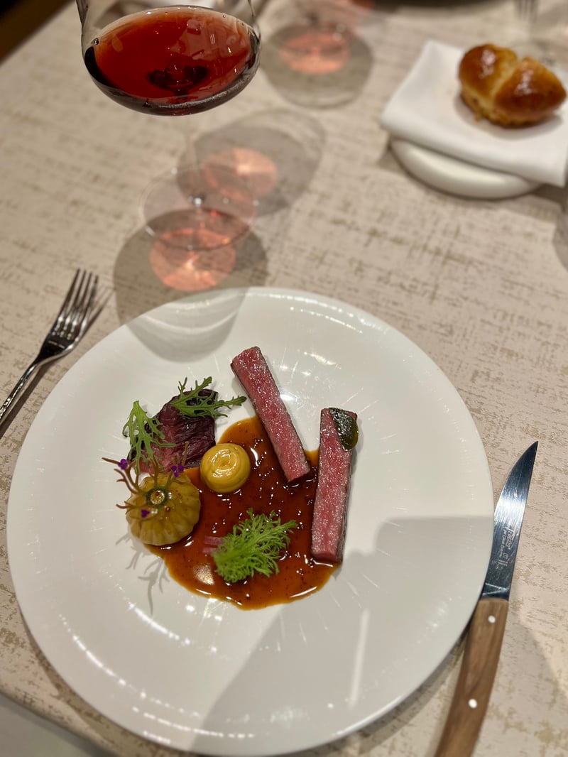 My husband preferred the A5 wagyu ribeye from Arita Farm in Miyazaki. Cut into thick slices and seared with precision, the meat reveals exceptional marbling, melting and juicy. The intense brown jus underscores its aromatic depth without ever overpowering it. The radicchio brings a structuring bitterness, the dry-aged beet develops concentrated and slightly sweet notes, while the yakiniku-style black garlic reinforces the umami, balanced by the herbaceous vivacity of egoma mustard.