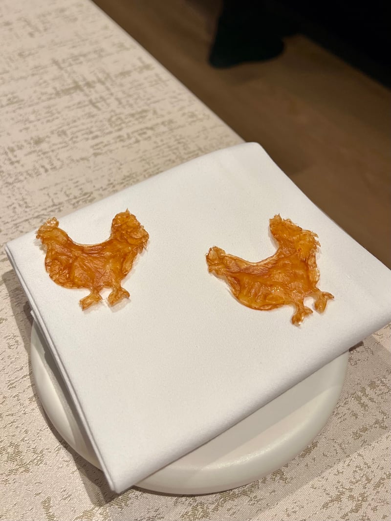 For the main course, I opted for the free-range chicken aged with koji. Its flesh, of a pearlescent whiteness, is particularly tender and juicy, the result of masterful aging. It is coated in a vin jaune sauce with deep accents, in which morels bring an earthy, woodsy dimension. The kabocha squash, sweet and slightly sugary, balances the ensemble, while the crispy chicken skin, cut into the shape of a rooster, adds a playful and indulgent touch, almost nostalgic.