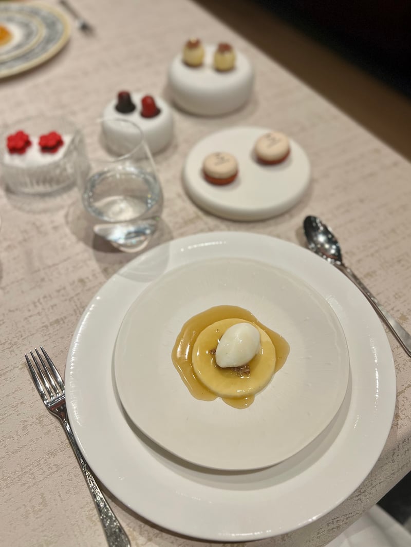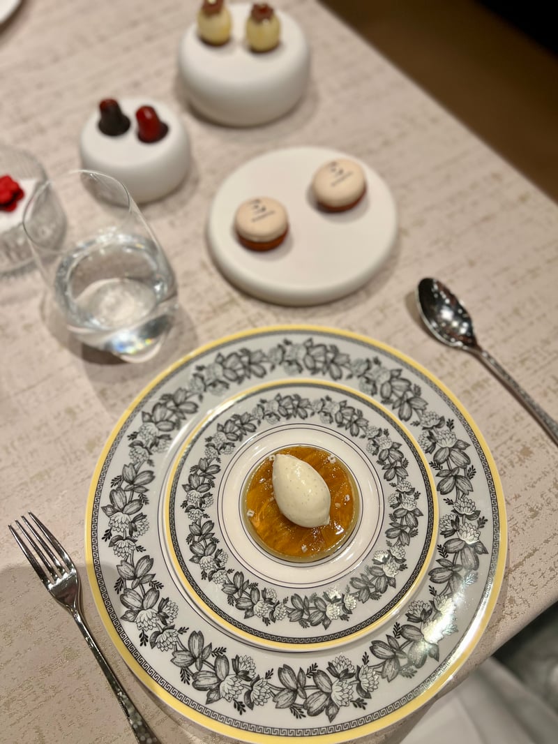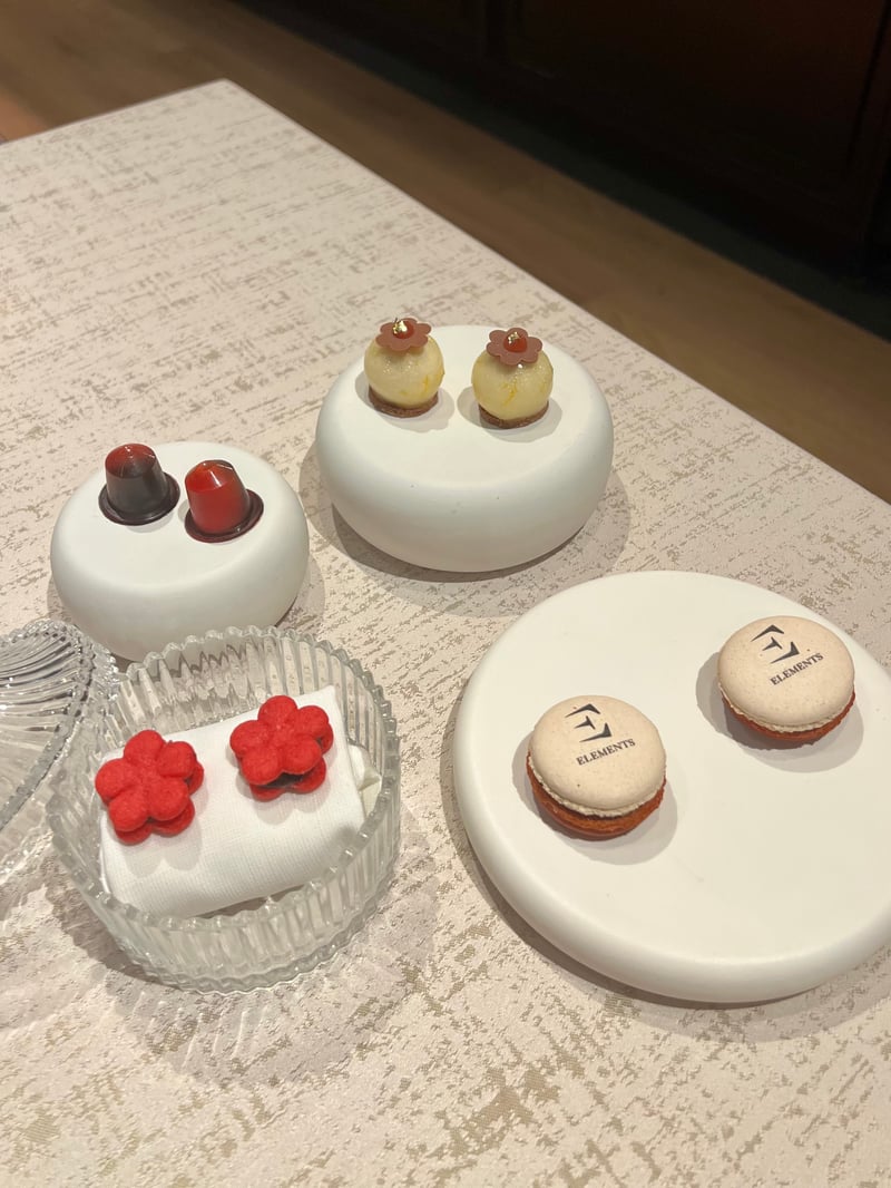 I opted for the Yame persimmon, showcased in a refined plate. Its melting, luminous flesh is elevated by a zesty Cha-Am lemon cream, bright and tangy. The vanilla chantilly brings a delicate roundness, while the chestnut shortbread adds a crisp, woodsy note. The dinner finally concludes with mignardises, presented like true pastry jewels. Macarons delicately marked with the Elements logo, floral bites, and spherical pieces compose a final gourmet score, playful and elegant. A joyful and poetic conclusion, extending the gastronomic experience with finesse until the very last bite.