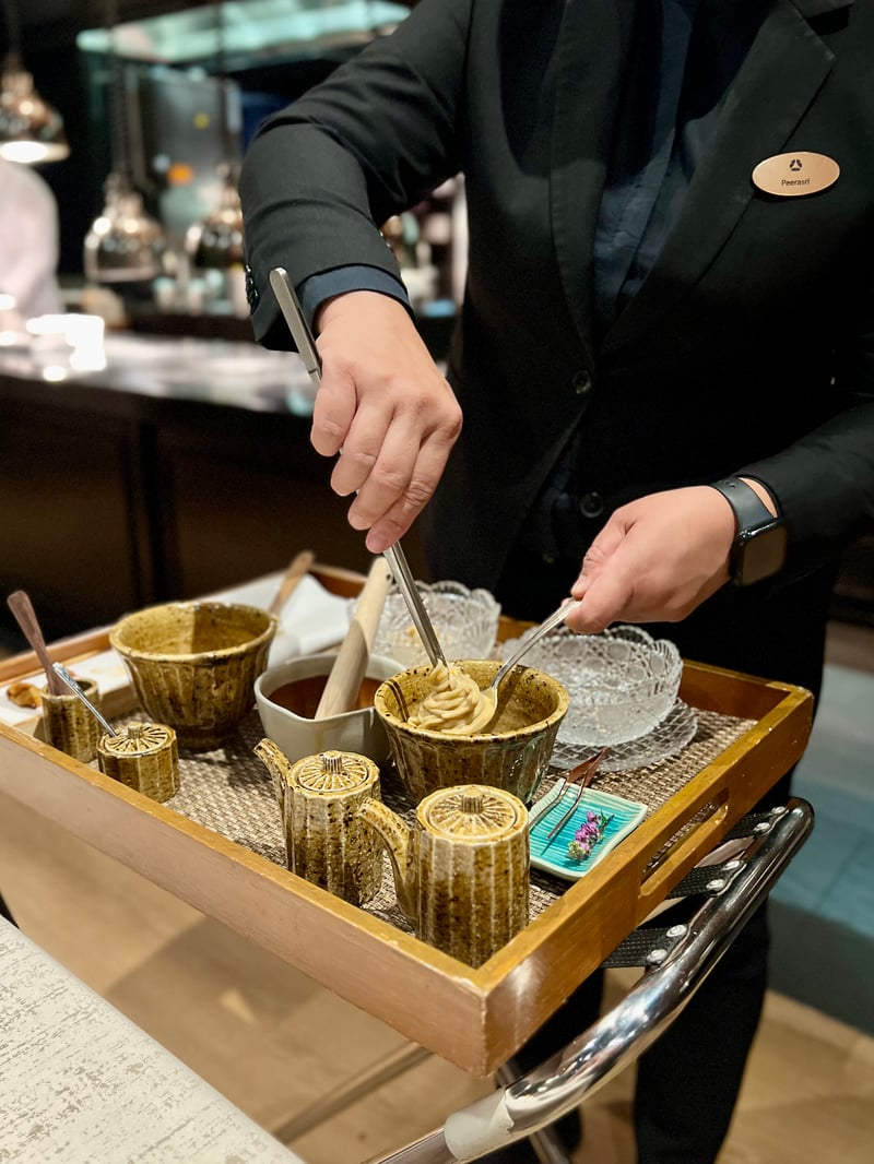 Elements, Inspired by Ciel Bleu stands as an exceptional table where every detail, from the setting to the last mignardise, contributes to an experience of rare coherence. Gerard Villaret Horcajo's cuisine captivates with its precision, sensitivity, and ability to elegantly bring French and Japanese cultures into dialogue. The autumn menu, at once generous, masterful, and deeply seasonal, tells a complete culinary story, carried by remarkable products and impeccable execution. This experience feels like a suspended moment, fully confirming the restaurant's place among Bangkok's great gastronomic tables.