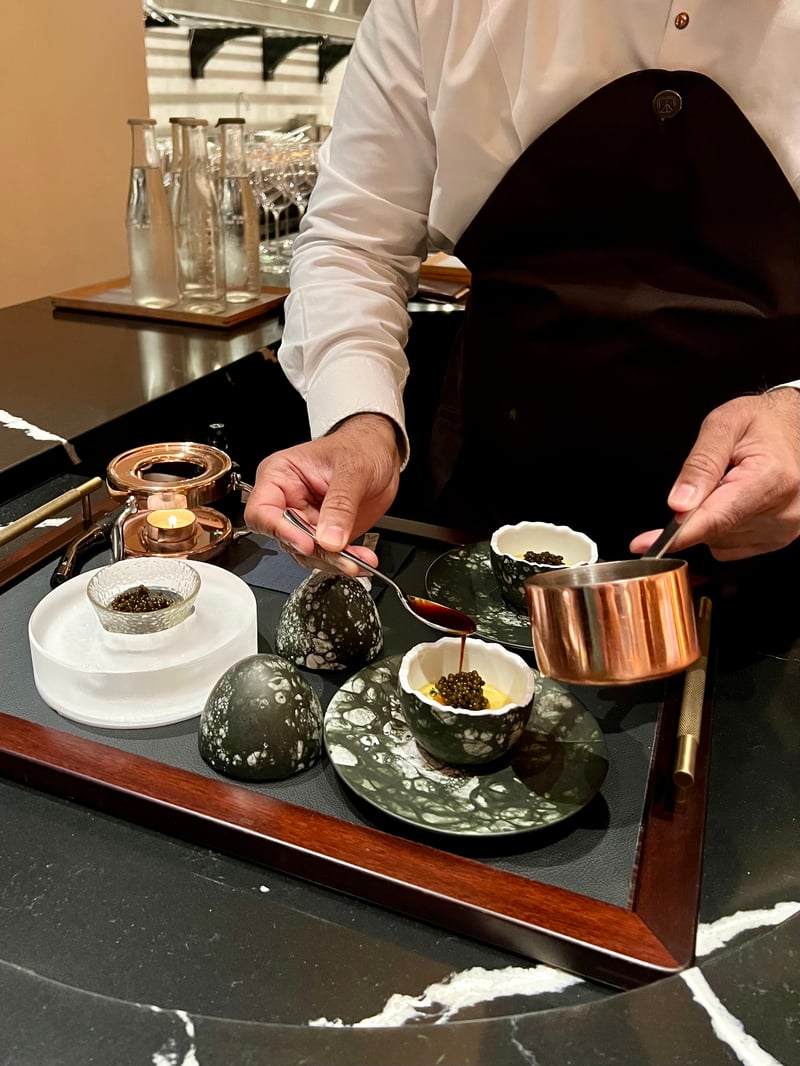 The dish entitled "PARSI LOVE AFFAIR" is a sophisticated culinary creation that pays homage to the rich Parsi culinary tradition of Gujarat, India. This unique dish begins with a base of Akuri, Parsi scrambled eggs, reinvented in the form of a delicate chawanmushi, a Japanese savoury custard. This custard is enriched with the sweetness of raisins, the crunch of macadamia nuts, and the umami flavour of seared shimeji mushrooms. For a final touch of luxury, it is garnished with smoked snow peas, carrot pieces, and a slowly roasted tomato juice reduction, elevated by smoked Japanese vinegar and house-smoked Oscietra caviar. The dish is accompanied by a clarified tomato juice with ume plum and bonito vinegar, enhancing each bite with exquisite flavours.