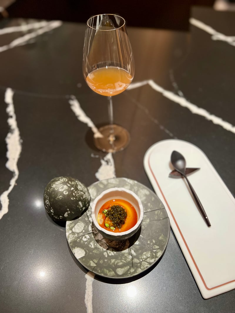 Let us continue with "WHEN THE PORTUGUESE CAME", a dish that evokes the culinary fusion between Portugal and Goa. The langoustine, grilled and coated in a Recheado marinade, stands out for its spicy and tangy flavours thanks to the innovative use of vinegar introduced by the Portuguese. This marinade combines chilli, aromatic spices, and vinegar, while a Goan emulsion uses prawn head fat, a creamy coconut gribiche, tamarind, and jackfruit for acidification. Alongside, the Ambotik, a sour-spicy Goan curry, is presented in a glass, harmonising perfectly with the langoustine flavours. This dish offers a captivating gustatory sequence, starting with the Ambotik, moving to the langoustine and gribiche, then returning to the Ambotik to conclude. It is accompanied by a non-alcoholic juice reminiscent of a Spanish rosé wine.