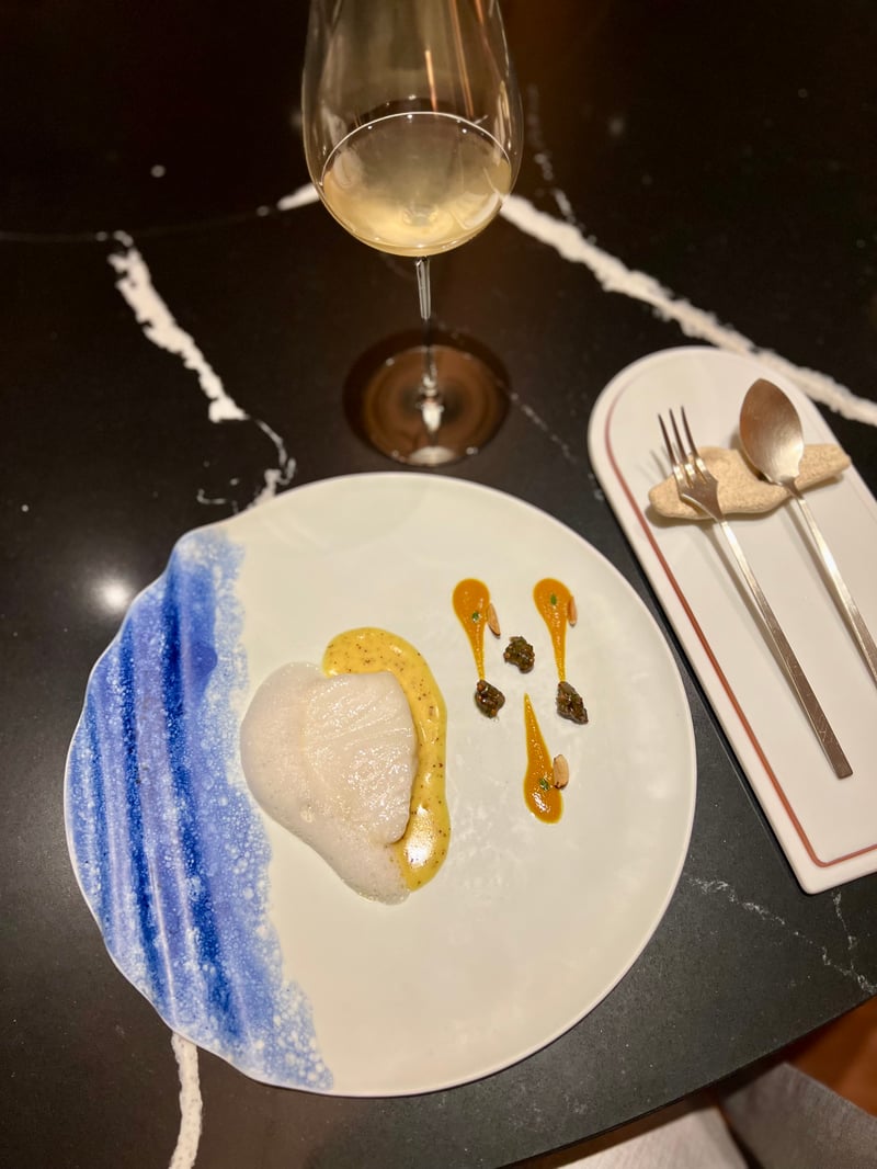 Comfortably seated at the chef's table facing the kitchen in action, we began with Opening Bites that were a true culinary exploration of Indian street food, reinterpreted with modern sophistication. The New Delhi chaat presents itself as a spice-infused yoghurt mousse, placed on herb chutney and mango-yuzu gel, all resting on a crispy tartlet. This creation wonderfully balances tangy, sweet, salty, and spicy flavours. The Gujarat patra offers an umami experience with its colocasia leaves filled with Hokkaido scallops and seaweed, fusing land and sea in an appetising roll of flavours. The dhabeli reinterprets the street snack as a beetroot shell, filled with Dabeli masala, raisins, and pomegranate seeds, offering a striking contrast between crunch and sweetness. The Mumbai vada pav takes the form of a small brioche bun filled with a spiced potato fritter, accompanied by tangy tamarind chutney, evoking the bustling streets of the city. Finally, the khari chai concludes these bites with a crispy cone filled with spiced lamb kheema, accompanied by a chai-inspired lamb soup, enriched with pistachios and spices, offering a comforting and flavourful finish. To perfect this culinary experience, a refined juice of saffron, dried citrus, and jackfruit was served, bringing a refreshing and exotic final touch.