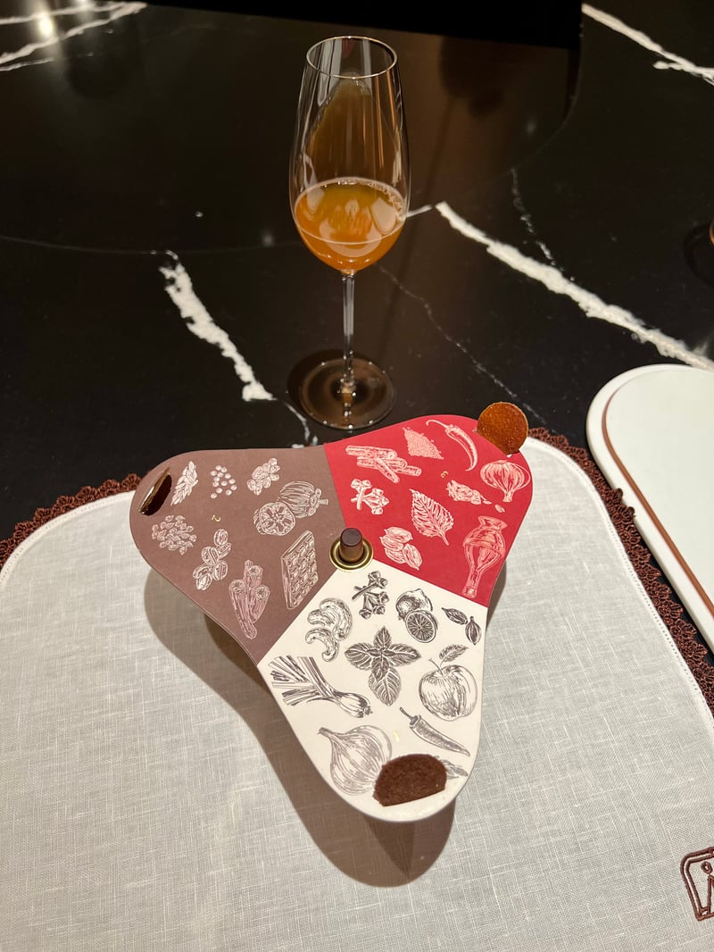 This interlude is presented playfully with three coloured sections, each adorned with different drawings, housing biscuits that play a decisive role in the culinary experience, influencing the sauce that will accompany the main course. A glass of black tea infused with yuzu is served alongside, offering a refreshing drink to cleanse the palate before continuing the gustatory adventure.