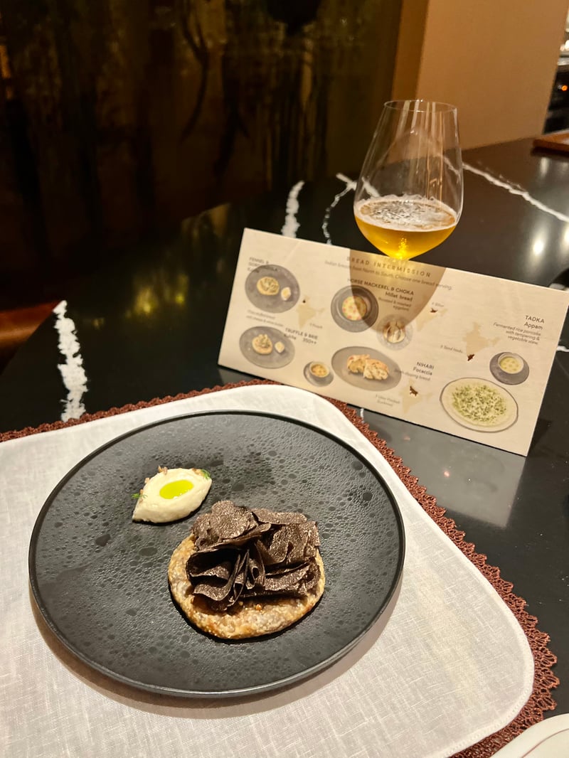 Among an exquisite selection of breads, our choice settled on two remarkable creations. My husband was seduced by the sumptuous Truffle and Brie Bread, a refined version of the tandoor-baked Amritsar kulcha. This flaky bread is delicately stuffed with truffle, brie, and potato, and served with a brie sauce enriched with truffle and parsley oil, the whole completed by shavings of black truffle added tableside, offering a luxurious and fragrant gustatory experience. For my part, I opted for a millet bread topped with marinated mackerel, inspired by the traditional baigan chokha from Bihar state. The bread, grilled and brushed with mustard oil, is accompanied by a silky smoked aubergine pâté enriched with confit cherry tomatoes and a ginger glaze. These dishes are ideally paired with a non-alcoholic malt beer infused with citrus, which balances the intense flavours of the dishes with a fresh and tangy note.
