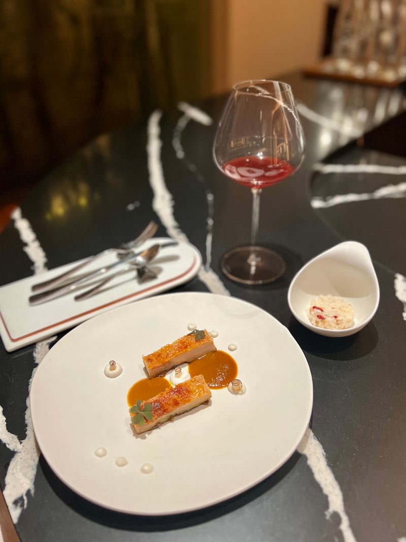 The dish entitled "KEBAB-LOVING KING" is a luxurious reinterpretation of the legendary Galouti Kebab of Awadh, traditionally conceived for a 16th-century toothless king. This version uses foie gras, celebrated for its melt-in-the-mouth texture, perfumed with aromatic spices typical of royal Awadhi cuisine. It is accompanied by marinated pears and cherries, and an aromatic jus that enhances the dish's exquisite flavours. As a complement, a sheermal — a saffron and cardamom bread — is served to elevate the gustatory experience. The suggested pairing with this delicate creation is a Japanese grape juice, enriched with fermented sesame and black tea, accentuating the sophistication and elegance of this dish.