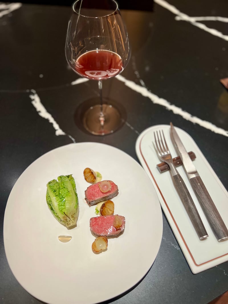 For my part, I opted for the BURRA LAMB, a Mughal cuisine speciality, here elevated with New Zealand lamb fillet marinated in a traditional Burra blend. This dish is charcoal-grilled, giving it a light caramelisation and exquisite tenderness. It is served with a smooth onion purée, grilled French onions, and pieces of compressed green apple, creating a harmony of sweet and tangy flavours. This dish is ideally accompanied by a Pinot Noir grape juice and a rose oolong tea, adding a floral and fruity dimension to the overall culinary experience.