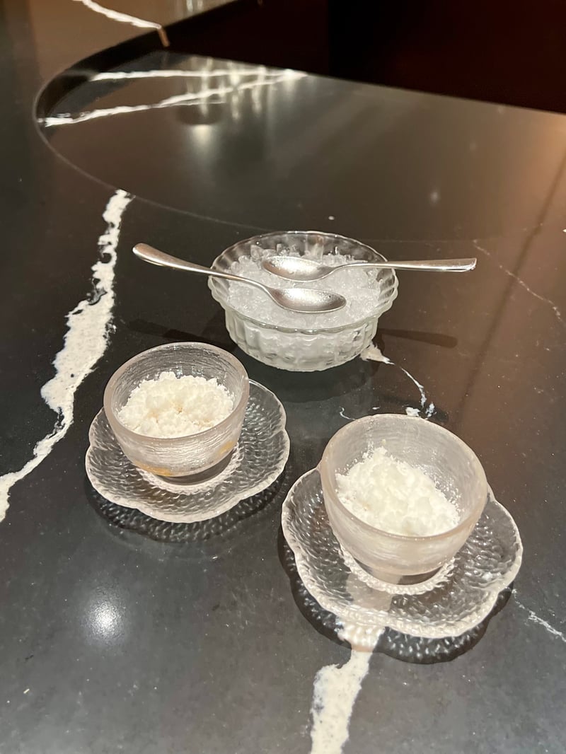 The pre-dessert "COCONUT AND JASMINE SNOW" is a delightful creation that evokes memories of Indian celebrations with its refined fusion of flavours. This dish is a delicate coconut and jasmine mousse, elevated by a salted ume coulis, a Japanese plum, adding a touch of salty complexity that harmoniously contrasts with the sweetness. The jasmine jelly and jasmine snow add layers of texture and fragrance, creating a balanced gustatory experience between richness, perfume, and acidity. Presented in elegant small cups, this pre-dessert is a perfect transition towards the sweet ending of a refined culinary journey.