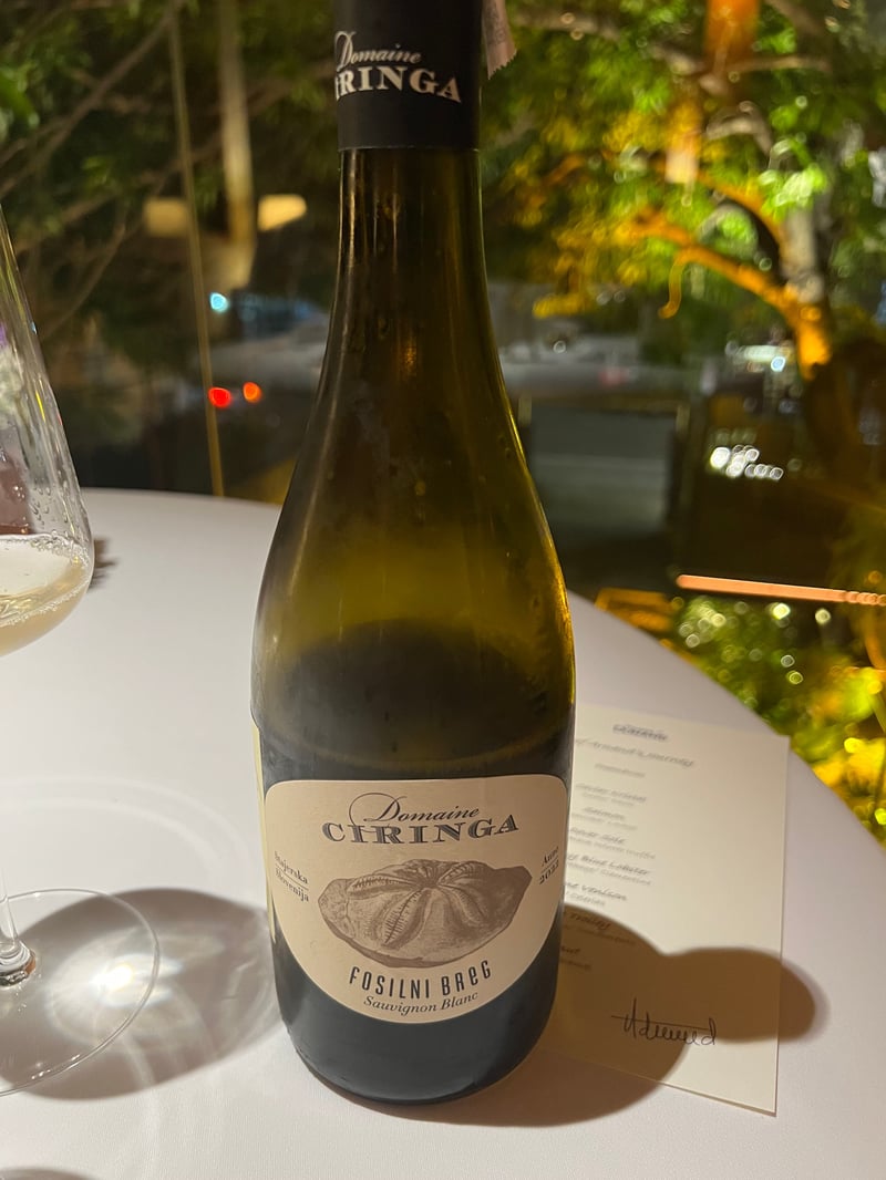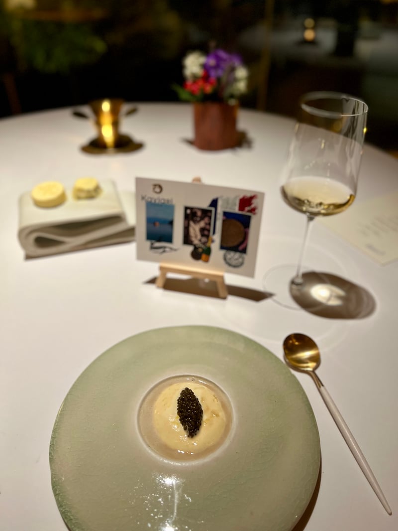 The dish "Cocollos N°1 Oyster / Lovage / Borage" takes us on a culinary symphony that evokes vivid memories of Brittany and the mountains. This bold creation presents the oyster in two forms: a delicate tartare below and a poached oyster on top, paired with two types of seaweed and a lovage sauce. The alliance between the fresh salinity of the oyster and the gentle bitterness of alpine herbs creates an unexpected yet harmonious dialogue, offering a taste experience suspended between sea spray and pure mountain air. Accompanied by a glass of Domaine Ciringa, Fosilni Breg Sauvignon Blanc, this dish is a true pleasure for the palate.