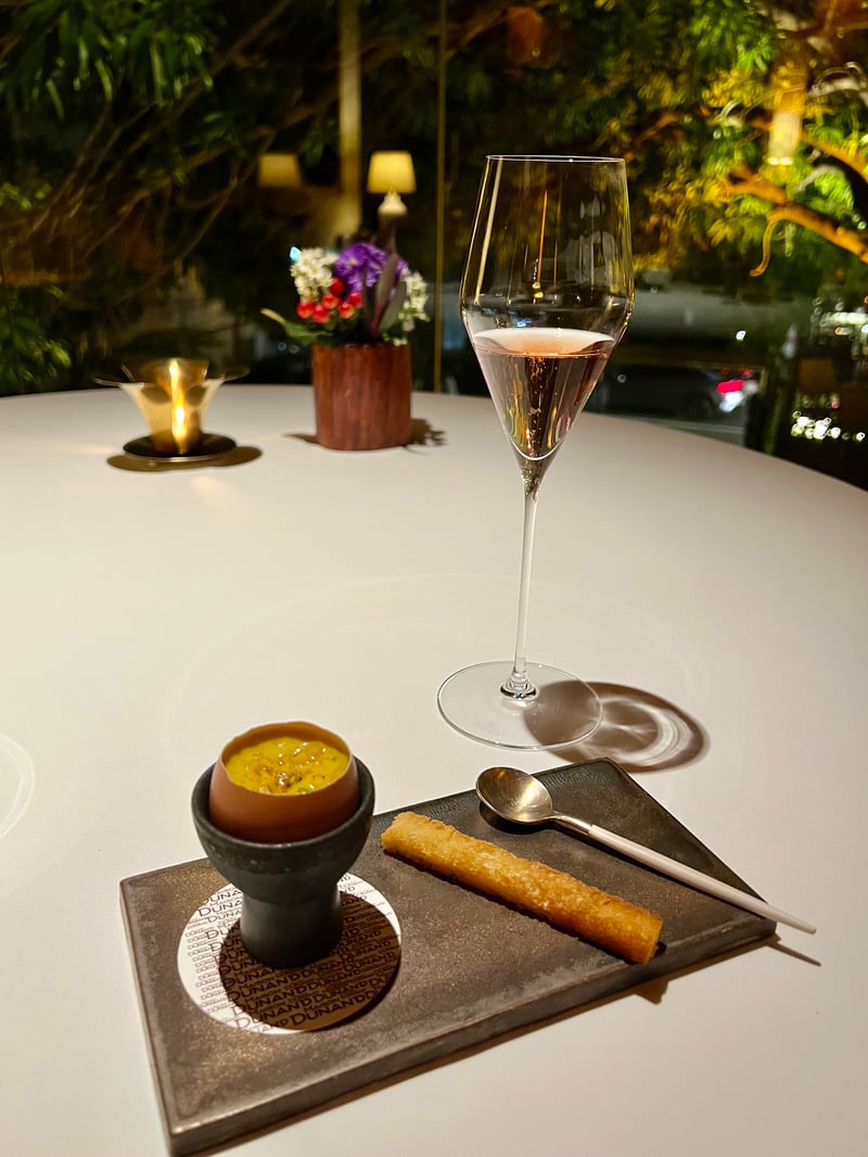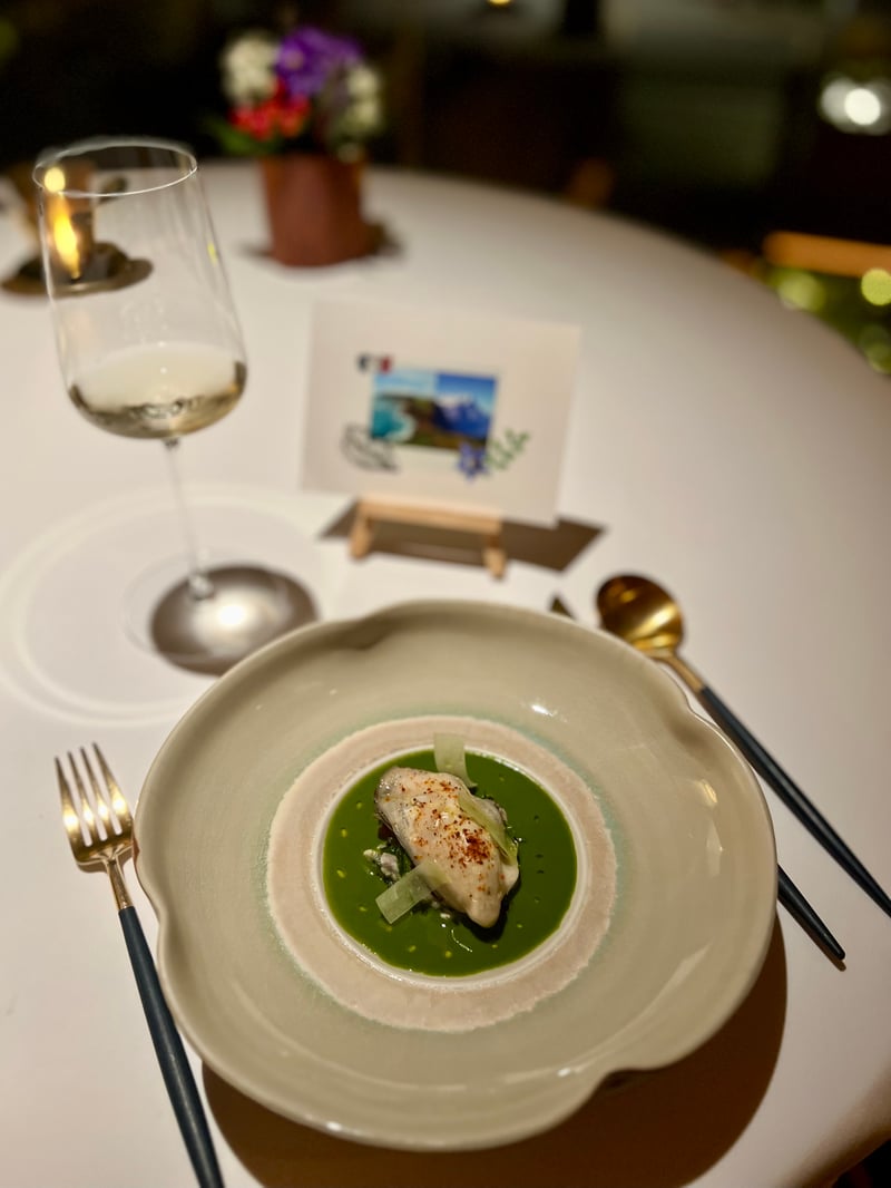 With this elegant presentation, this culinary preamble is a masterpiece in itself. The calamansi and smoked eel wafer offers a combination of tangy and smoky flavors, while the foie gras mulled wine macaron evokes a comforting richness and sweetness. The sesame tacos with bouchot mussels, coffee, and whisky promise a bold and innovative taste experience. Finally, the onion and tonka bean tartlet seduces with its sweet and spicy aroma, perfectly completing this sophisticated gastronomic tableau. Each element is carefully arranged, creating visual and sensory harmony, perfect for savoring with a glass of champagne.