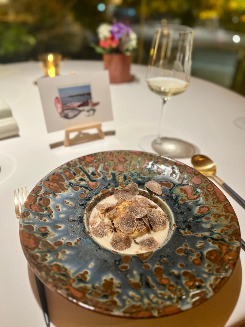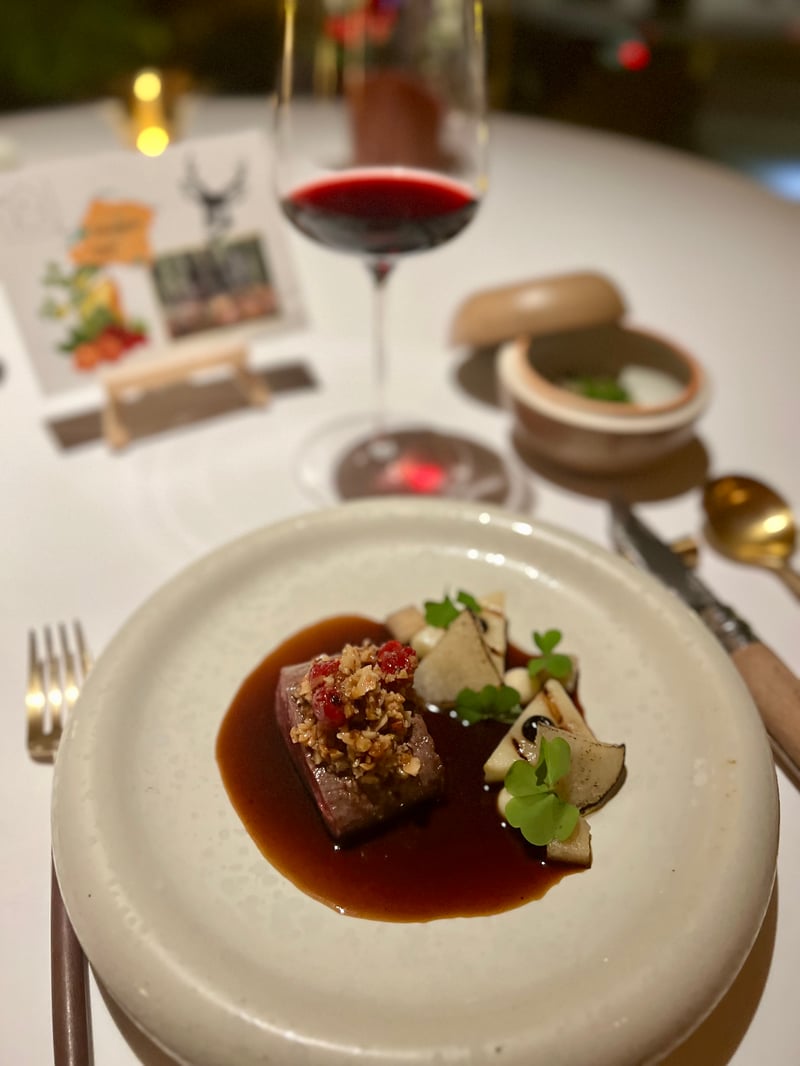Let us continue our journey with the Dover Sole, accompanied by endive and winter black truffle from Périgord, which presents itself as an elegant reinterpretation of a timeless classic. This line-caught sole meunière dish is elevated by a hazelnut crust that brings a crunchy texture and aromatic richness. The Périgord black truffle, with its enchanting fragrance, enhances the delicacy of the fish, while the endive adds a subtle note of bitterness, thus completing the harmony of flavors. To accompany this refined dish, a glass of Chablis Grand Cru Les Clos 2023 from Domaine Christian Moreau Père & Fils, whose minerality and freshness underscore the complexity of the dish, promises a superb gastronomic experience.