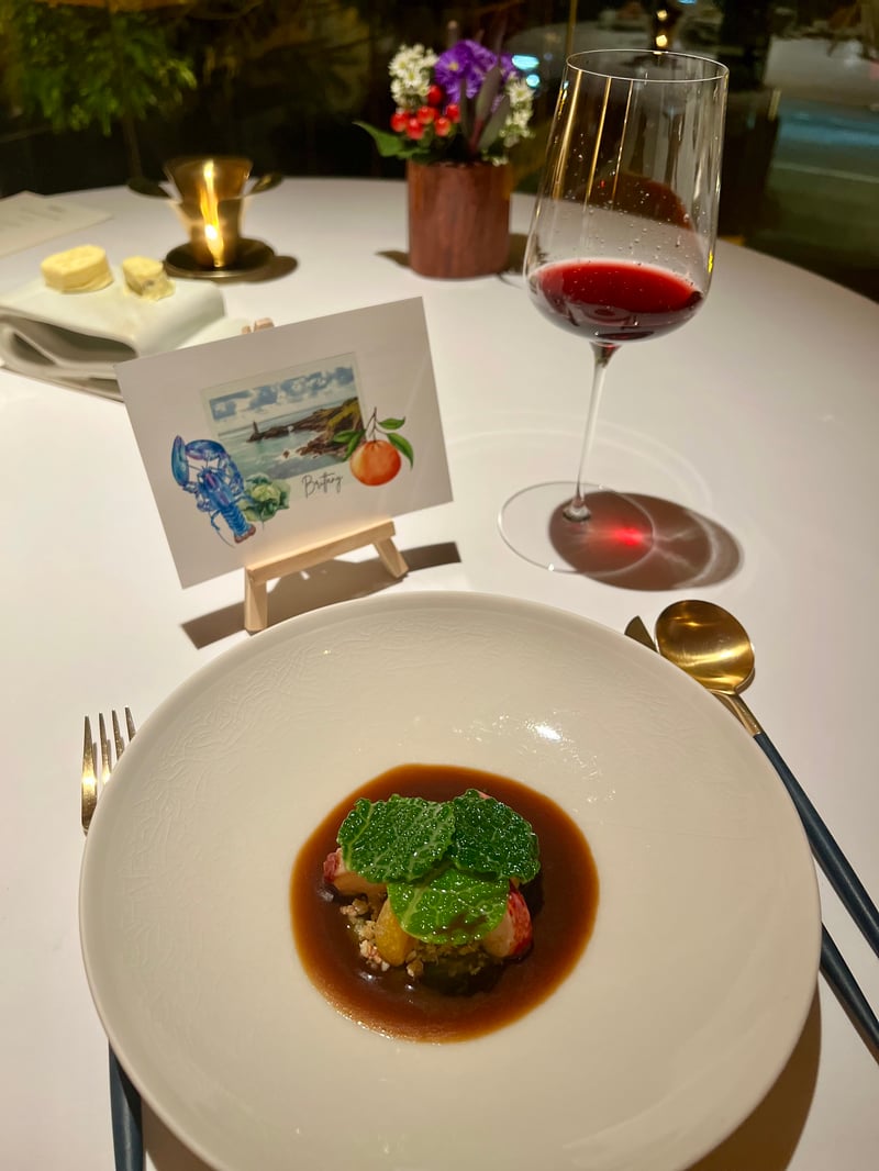 The Brittany Blue Lobster comes next, a refined dish that combines winter flavors with exceptional elegance. The lobster is accompanied by smoked cabbage and Corsican clementine, bringing a richness of textures and an unprecedented taste harmony, elevated by a red wine bisque. This culinary composition highlights depth and warmth, while emphasizing the rustic and authentic character of the terroir. To perfect this experience, the pairing with the wine "Domaine des Ardoisières, Argile Rouge 2019" enriches each bite with additional nuances.