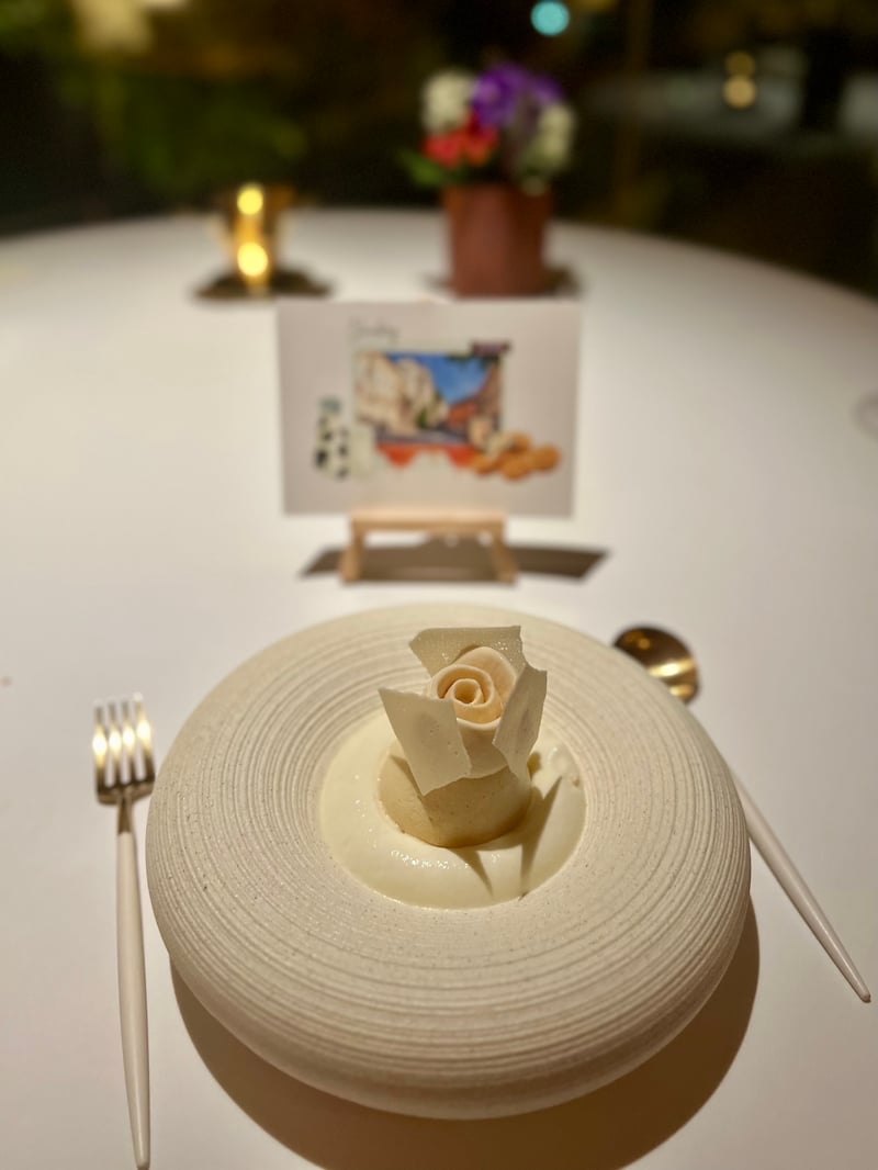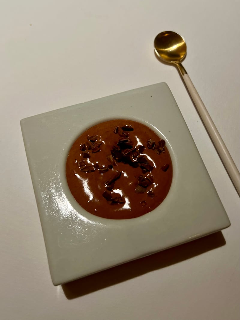 Before concluding, a pre-dessert paying tribute to the chef's childhood memories makes its appearance, with a delicate chocolate mousse. The 70% Chiang Mai chocolate sauce is skillfully blended before us with a sabayon, creating a perfect harmony of rich and creamy flavors. Everything is elegantly sprinkled with cocoa bean pieces, adding a crunchy texture and additional chocolate intensity.