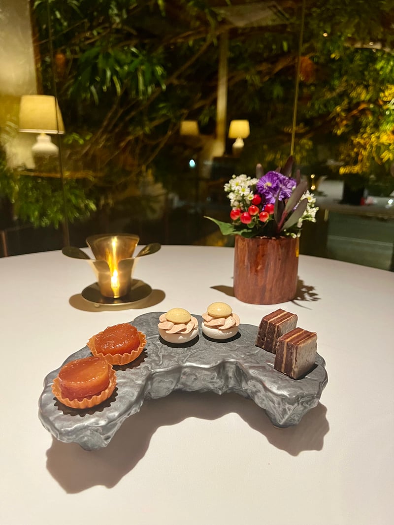 To close this exquisite meal, an elegant presentation of petit fours reveals a trio of sweet delights, each carefully arranged on a stone platter. On the left, a miniature Tatin seems to exhale caramelized and fruity aromas, its appetizing texture capturing the essence of a classic tarte tatin. In the center, the mont-blanc is reimagined as a delicate bite, with its airy chestnut cream and immaculate meringue, topped with a small touch of sweetness. Finally, the Opera displays its harmonious thin layers, revealing a perfect marriage of chocolate, coffee, and ganache, typical of this sophisticated pastry. These petit fours promise the end of a refined and enchanting taste journey.