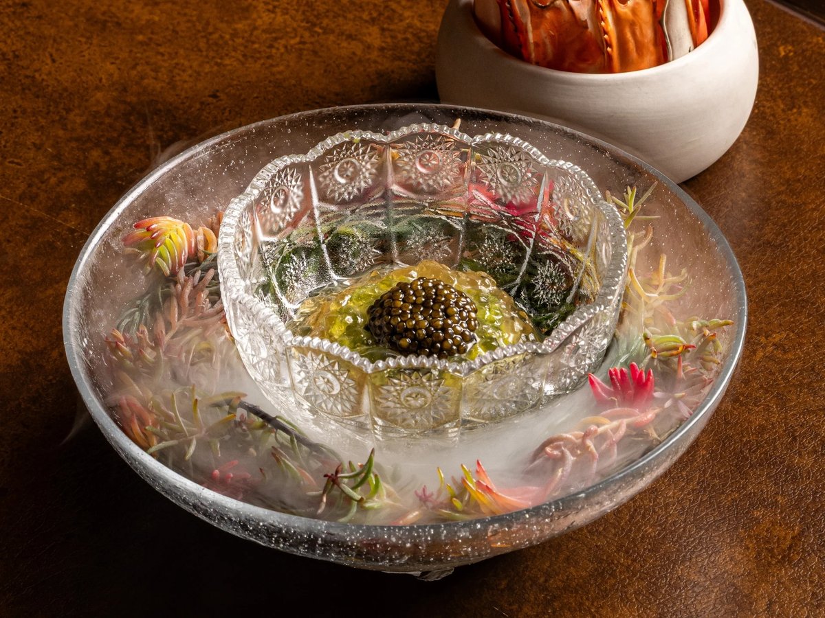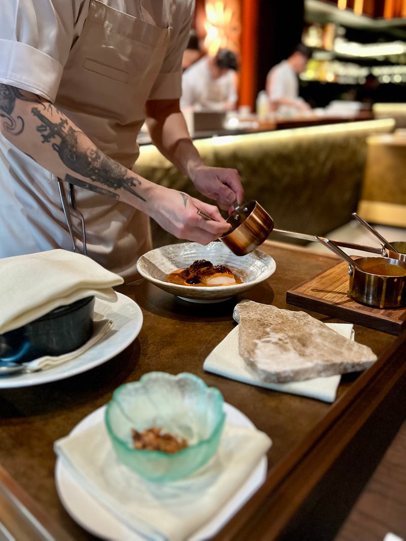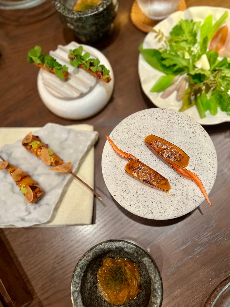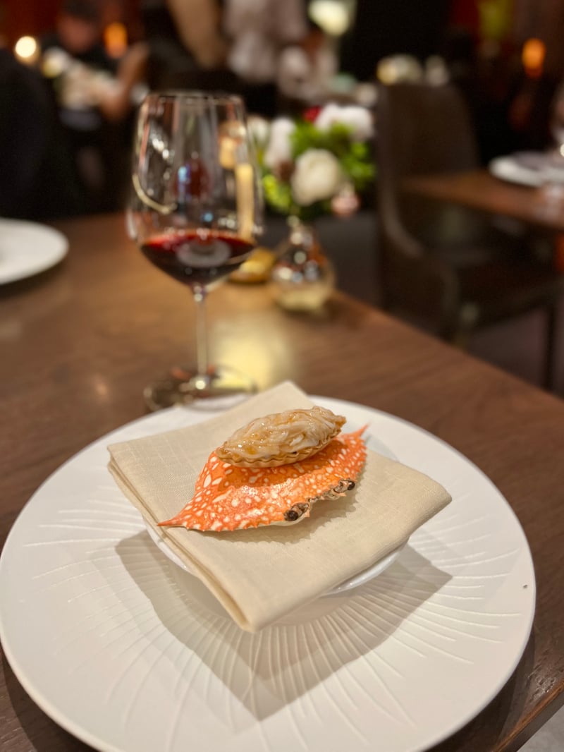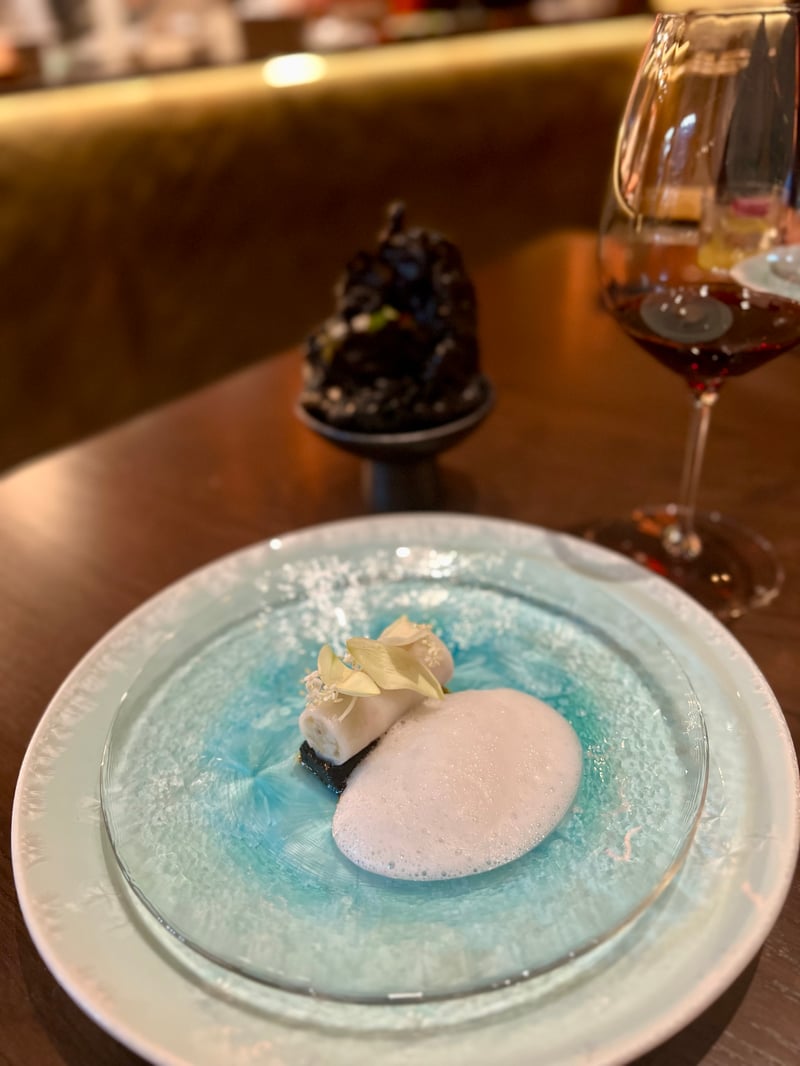 Grouped under the title Seasonal Snacks, the following bites highlight seasonal produce through finely balanced textures and flavors. Corn & Uni takes the form of a canelé, crisp on the outside, enclosing a silky mousse of corn and sea urchin with soft, milky, and naturally sweet notes. Local Fish appears as an elegant shallot tartlet accented with lemongrass, where local fish replaces the shrimp usually used, bringing subtle freshness and aromatic nuance. Finally, Blue Crab combines crab and tofu in a delicate composition, enhanced by a light aioli that underscores the sweetness of the crustacean.
