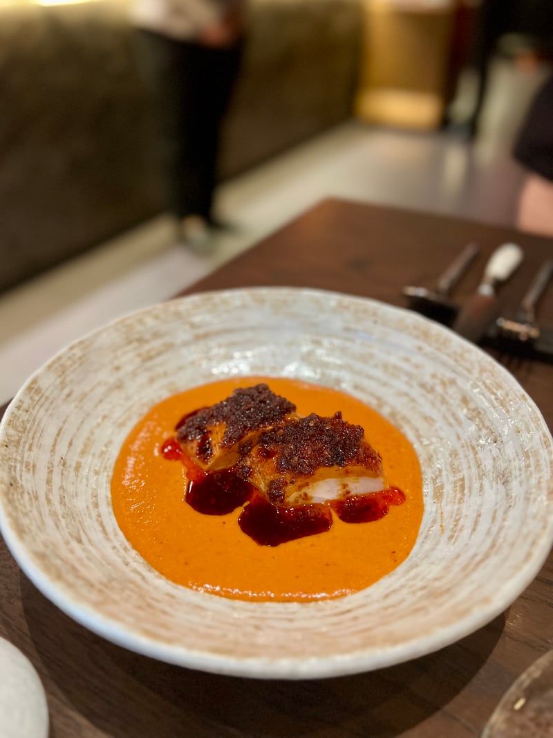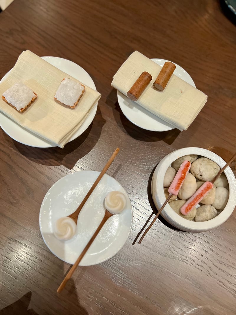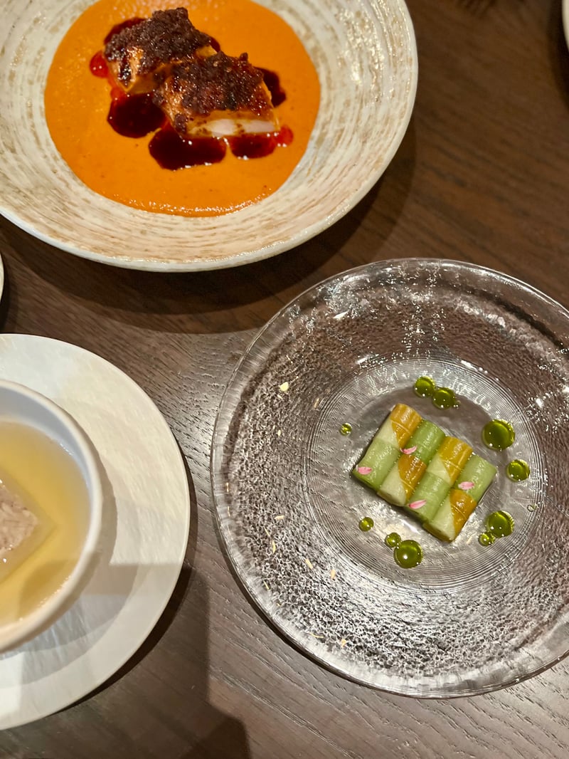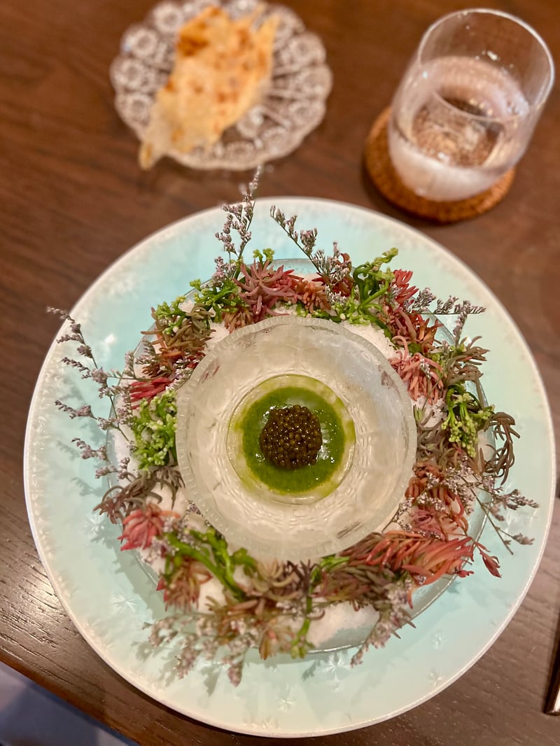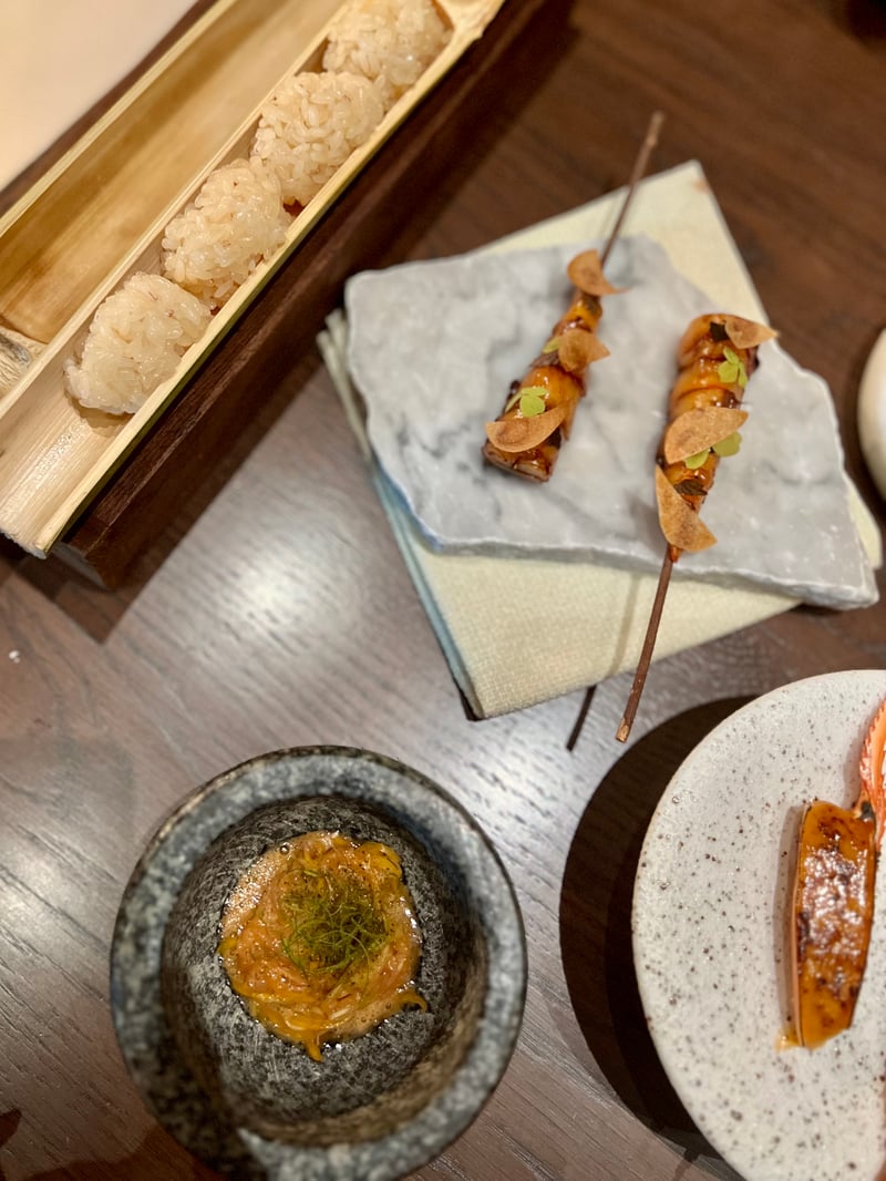 Grouped under the title Seasonal Snacks, the following bites highlight seasonal produce through finely balanced textures and flavors. Corn & Uni takes the form of a canelé, crisp on the outside, enclosing a silky mousse of corn and sea urchin with soft, milky, and naturally sweet notes. Local Fish appears as an elegant shallot tartlet accented with lemongrass, where local fish replaces the shrimp usually used, bringing subtle freshness and aromatic nuance. Finally, Blue Crab combines crab and tofu in a delicate composition, enhanced by a light aioli that underscores the sweetness of the crustacean.