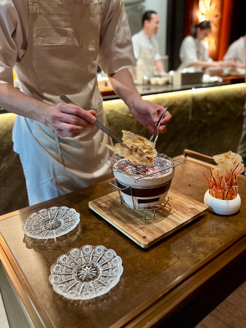 The transition to dessert comes with Seasonal Fruit, a composition imagined by Chef Saki that blends Thai references with Japanese sensibility. Presented as a series of petits fours, this sequence showcases seasonal fruits worked with finesse: guava paired with a chili paste for a sweet-spicy contrast, a gently soft banana bite, and a reinterpretation of mango sticky rice in the form of a tartlet, where sticky rice is replaced by delicate mochi. A longan jelly completes the ensemble, bringing freshness and lightness, and subtly preparing the palate for what follows.