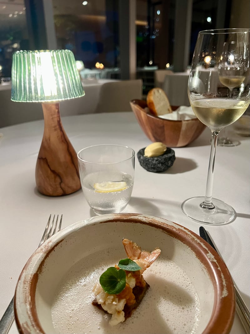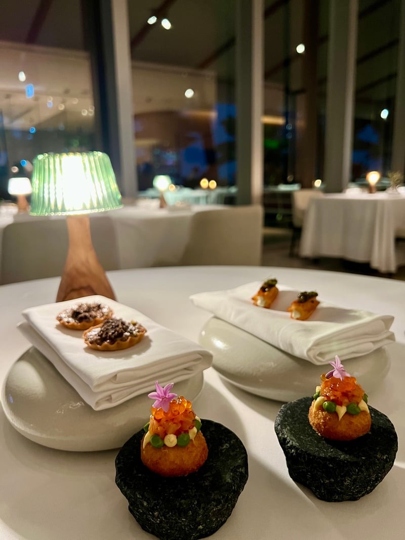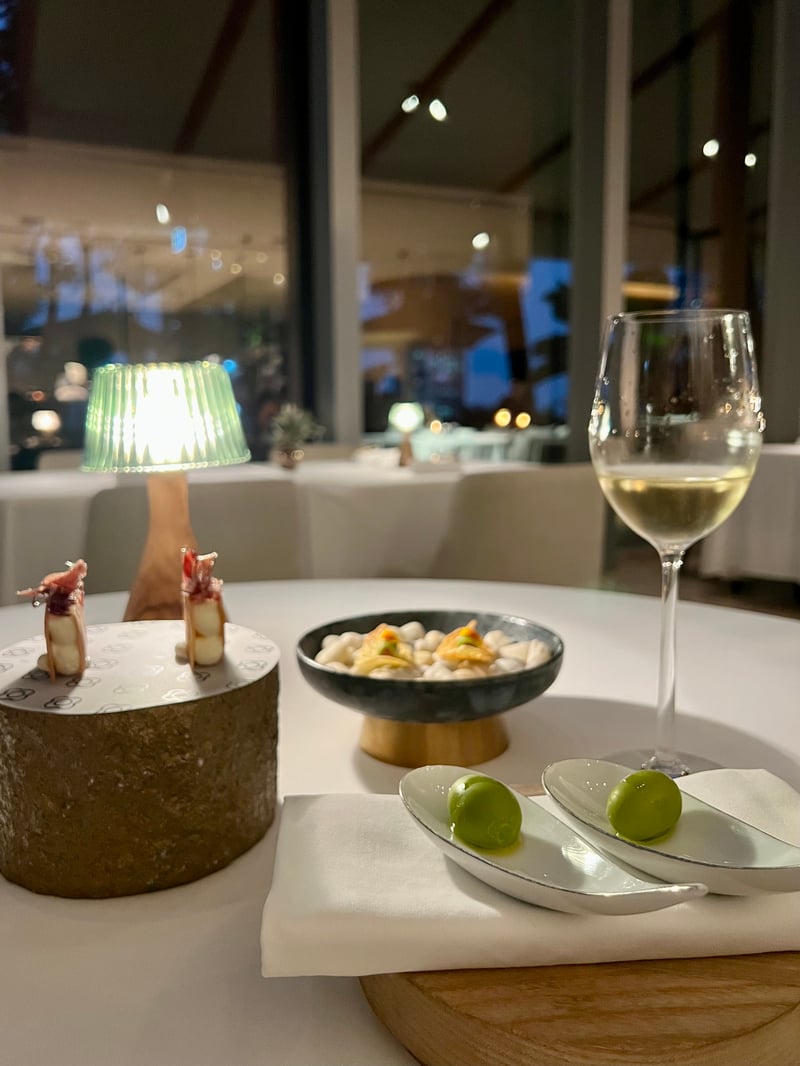 Our evening at the Embassy Room – Catalan Cuisine turned into a true culinary odyssey through the Tradicio I Evolucio nine-course menu, each accompanied by a carefully selected wine pairing to celebrate the richness of Spanish wines, especially exceptional white wines. The adventure began with bold appetizers, true ambassadors of Catalan cuisine, where olive, churro, and croqueta managed to awaken our taste buds, followed by bread inviting to be dipped in Spanish olive oil. The following dishes, such as foie gras, sea urchin, vinegar but also grilled langoustine, Iberian broth, pork belly, were a demonstration of refinement and mastery, showcasing noble products with remarkable precision.