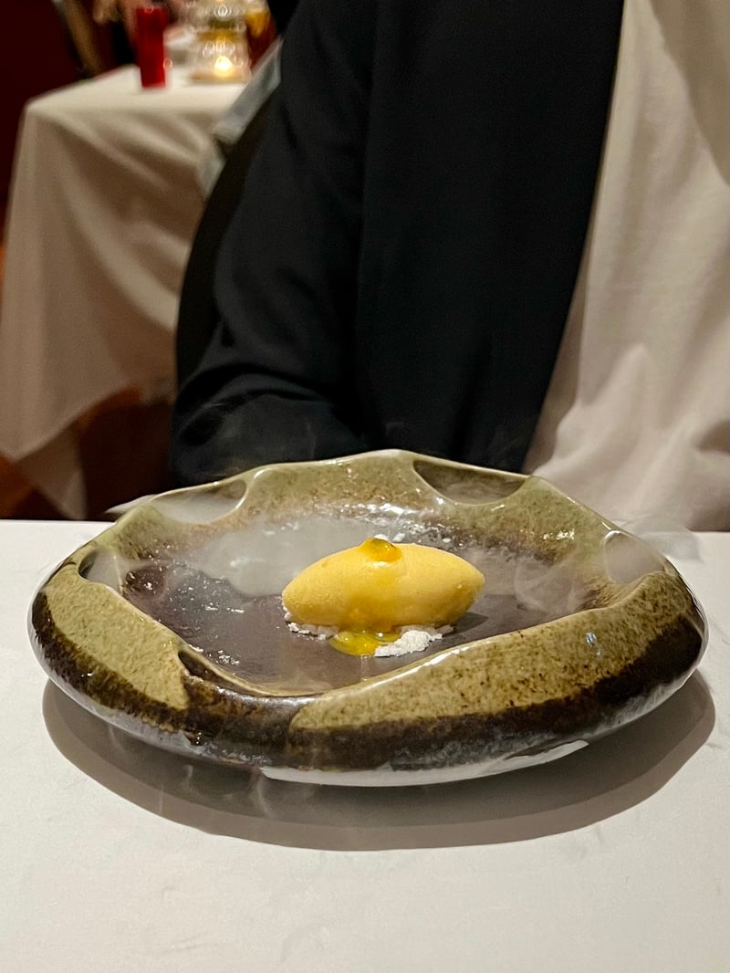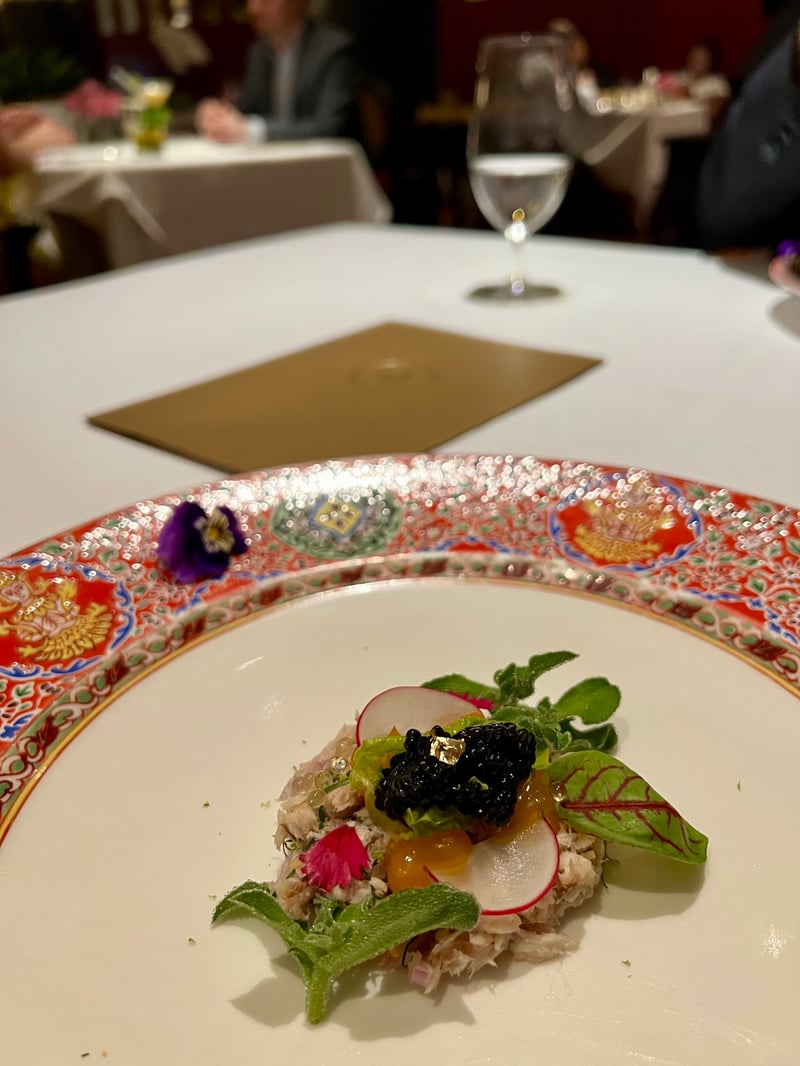 From the moment I arrived at R-HAAN, the elegance of the venue and the attention to every detail signaled an exceptional evening. A map of Thailand, drawn with lobster powder, stood before me, marking the beginning of our culinary journey. Each region of the country was revealed through a succession of refined and inspired amuse-bouches. The North began with a Lanna-style confit tomato salad, nestled in a golden pastry and accompanied by a creamy avocado mousse from the Royal Project. The next bite, from the Central region, featured a stuffed shiitake mushroom, elevated by the subtlety of Thai spices and delicately placed on a leaf-shaped base. Then, heading to Isan, a spicy catfish and wolffia croquette delivered a perfect balance of crispness and tenderness, enhanced by a touch of fermented fish sauce. Moving further South, I discovered a terrine of fermented fish entrails, served with pineapple chutney and turmeric crisp, a bold mix of textures and flavors. Finally, my gustatory journey ended on the Eastern coast with a green onion pancake filled with crab fat paste, where the sweetness of stir-fried noodles met the briny richness of crab in an incredible marriage of finesse.