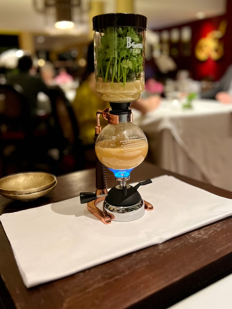 The following dish honored mastered simplicity: organic whole grain rice served with grilled shad grouper and a mild chili-ginger sauce. Modest in appearance, this dish unveiled surprising complexity thanks to the precise cooking of the fish and the perfect harmony of seasonings. A royal passion fruit sorbet then refreshed the palate before the arrival of the main course: a trio of Thai culinary icons. A coconut milk crab meat dip, a traditional Thai dish passed down through generations, embodied the wisdom of Thai cuisine with its creamy texture contrasting with the crunch of seasonal vegetables. A sumptuous Royal Tom Yum with giant river prawns featured a broth infused through a siphon, releasing powerful aromas. Finally, a Panang curry with roasted duck had a velvety sauce with perfectly balanced spices. The Royal Thai Tom Yum, recognized by UNESCO as an emblematic element of Thai culinary heritage, was elevated in a contemporary version using a siphon to amplify the soup's aromatic depth. The tableside preparation added a gastronomic dimension to this iconic dish.