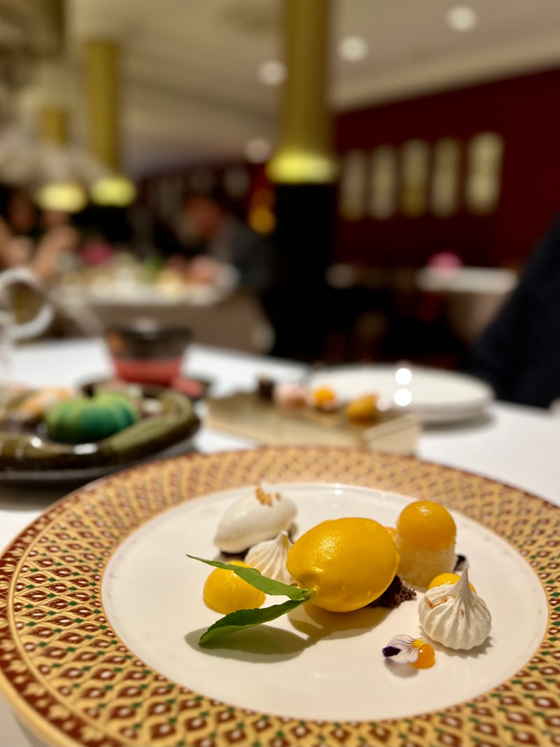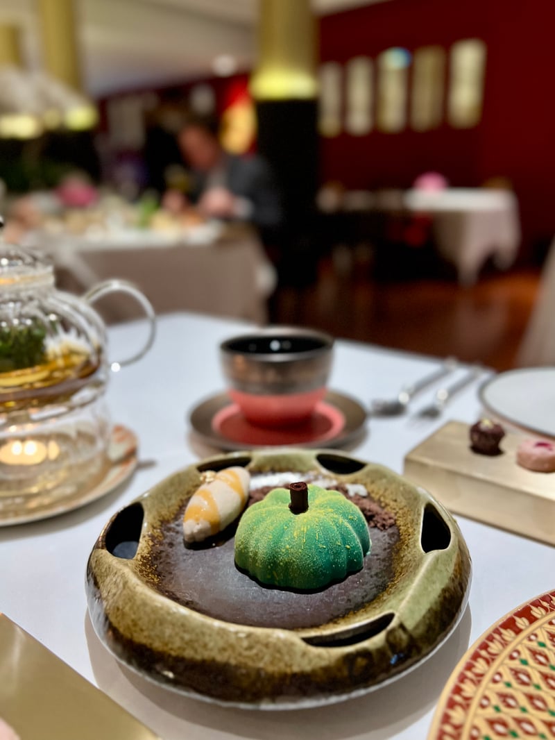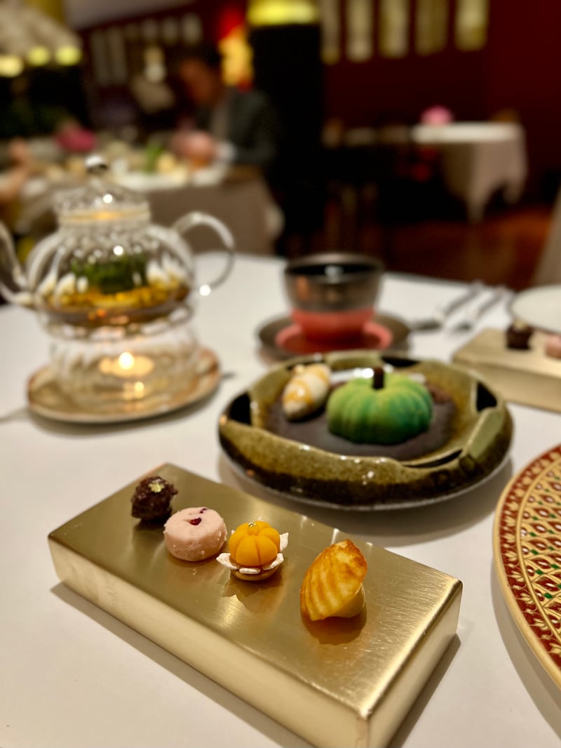 Finally, a selection of petits fours provided a last indulgence: a honey and vanilla madeleine, Thai tea chocolate, and a delicate rose-scented bite, extending the pleasure to the very last moment.