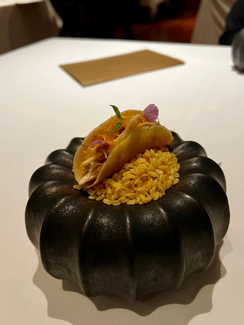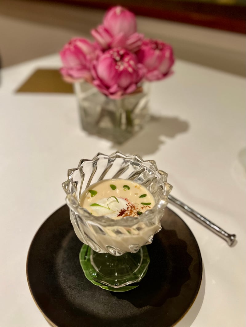 The first dish, a grilled mackerel wrapped in a leaf, set the stage for the rest of the feast. Served with a sauce of aromatic herbs, caviar, and a smoky finish, it beautifully showcased respect for the terroir. Next came crispy Thai pancakes, a trio of coconut fillings blending tender crab meat, flavorful coral, and fragrant coconut shavings. Their crunch perfectly contrasted with the richness of the filling. Then, the Andaman Sea took center stage with a Thai coconut soup featuring spiny blue lobster, an explosion of flavors where the coconut milk's sweetness enveloped the boldness of curry and Thai herbs, a dish I adored.