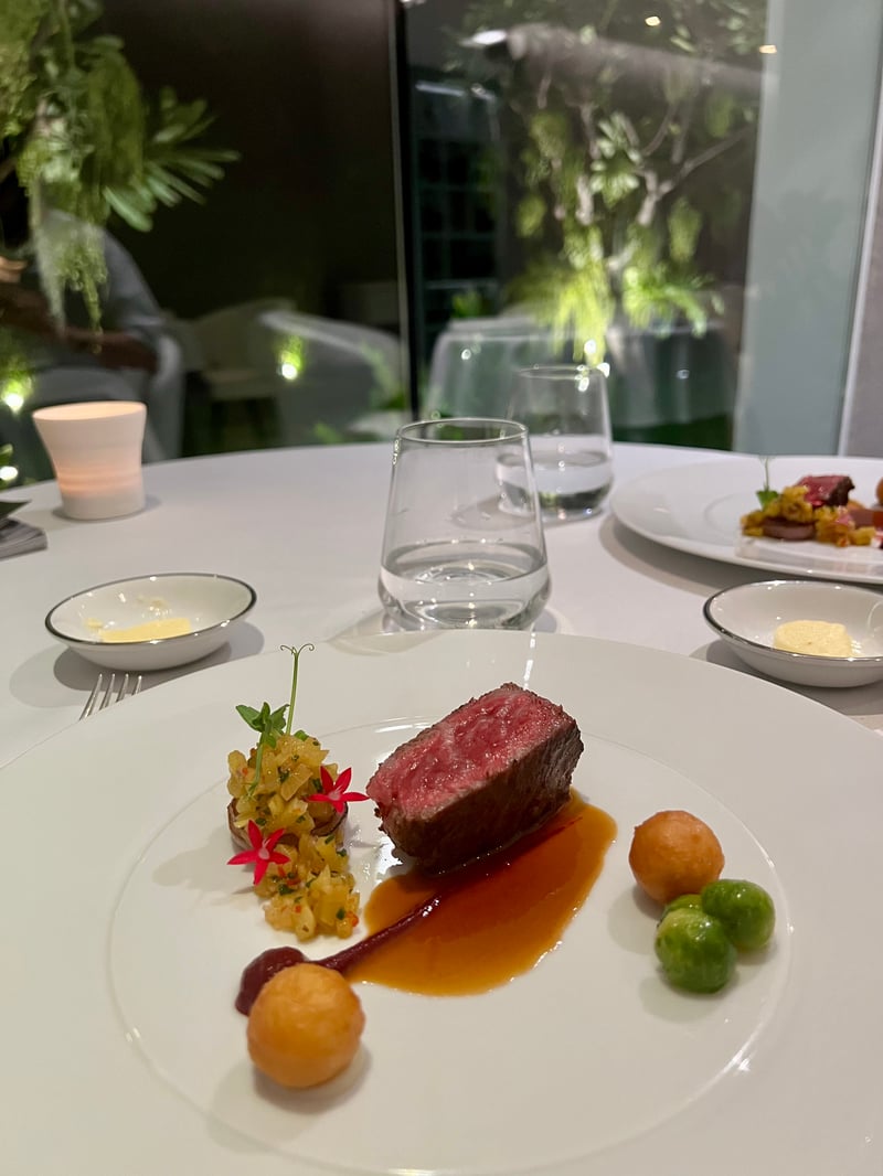 The A5 wagyu, meanwhile, was served in a thick slice, perfectly seared to preserve its pink, juicy center. It rested on a rich sauce, flanked by beetroot purée, grilled pineapple, crispy polenta, and shallot confit. Brussels sprouts and airy croquettes rounded out this intense, balanced, and flavorful dish.