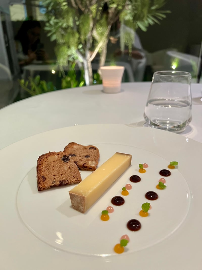 As a transition to dessert, cheese was treated with the same precision. A piece of aged Comté, accompanied by walnut and dried fruit bread, was highlighted with apple syrup, apricot and white peach jelly, and a few micro herbs. A graphic and aromatic take on the cheese board.