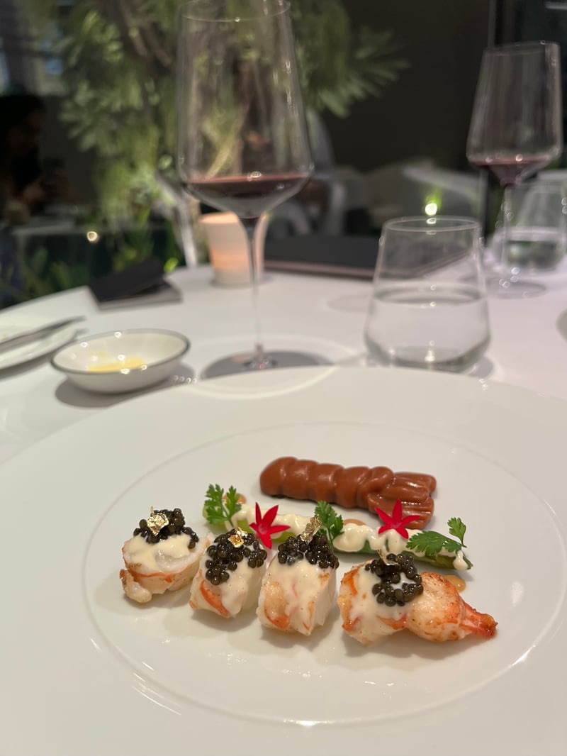 The first course, Royal Oscietra Caviar & Langoustine, elegantly combines tender langoustine from Denmark with a delicate cream, elevated by Oscietra caviar, gold leaf, and a few flowers. In the background, a langoustine jelly shaped like a marine shell completes this refined homage to the ocean.