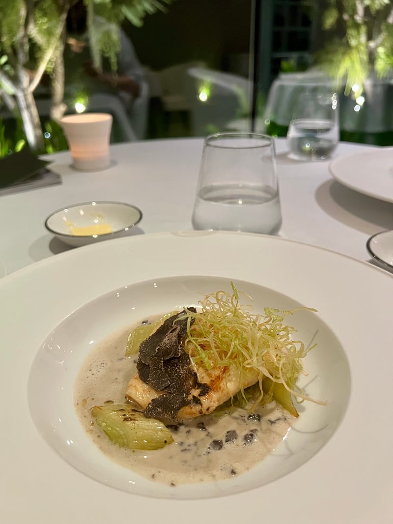 For the main course, we had a choice between wild turbot from the North Sea or A5 Kagoshima wagyu beef. The delicately pan-seared turbot revealed a tender, pearly flesh. It was accompanied by leeks in various forms – soft, roasted, fried – and topped with a rich, creamy truffle sauce, sprinkled with shavings and fresh slices. A dish of finesse, between vegetal softness and woody depth.