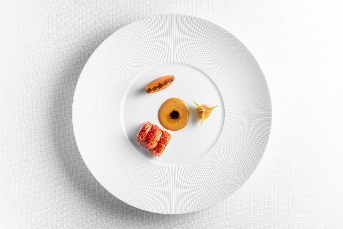 Next came a perfectly cooked lobster medallion, draped in a velvety amber-hued sauce delicately scented with vanilla. A quenelle of purée topped with hazelnut cream, along with a crispy garnish reminiscent of caramelized hazelnut shards, added texture to the dish. The reddish-orange, slightly thick jus offered a vegetal, tangy composition made with Datterino tomatoes, thyme, rosemary and rhubarb — a welcome counterpoint to the lobster's sweetness.