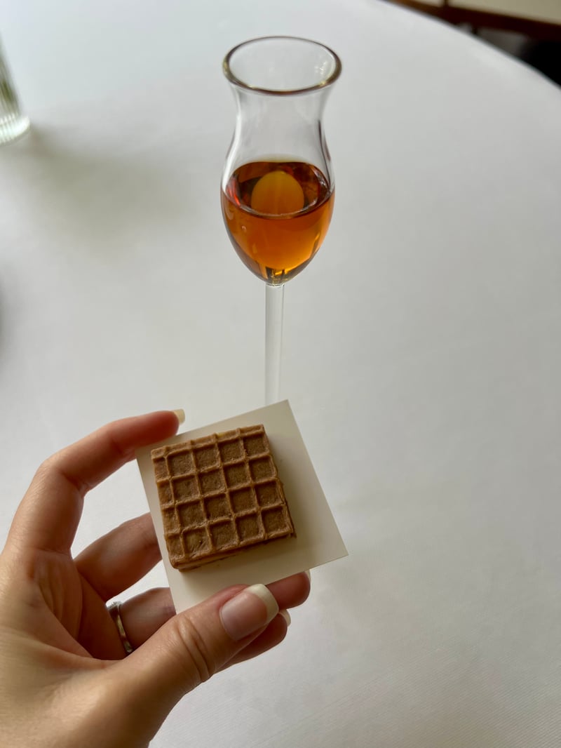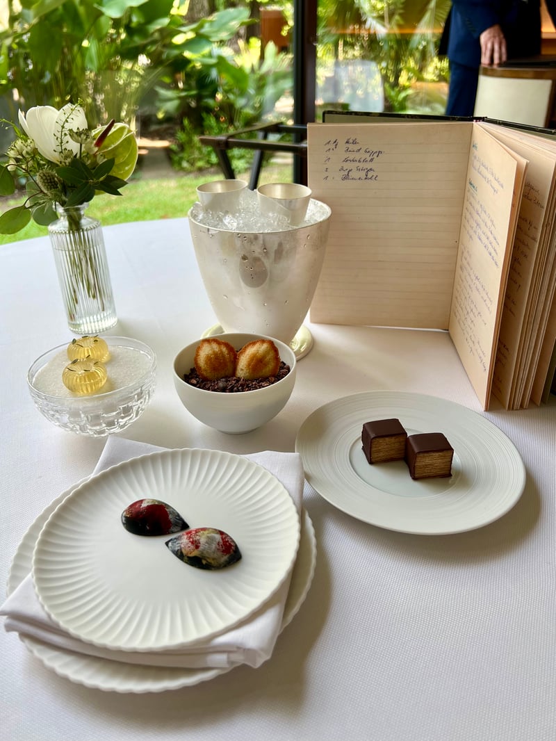 Finally, the last plate paid tribute to the chefs' grandmother, whose recipe notebook sat open on the table. A chilled egg liqueur was served in small metal cups. The golden, fluffy madeleines evoked childhood snacks, while marbled chocolates and layered chocolate-covered petits fours recalled festive occasions. More than a dessert, it was a transmission of memories — an emotional conclusion to this sensory experience.