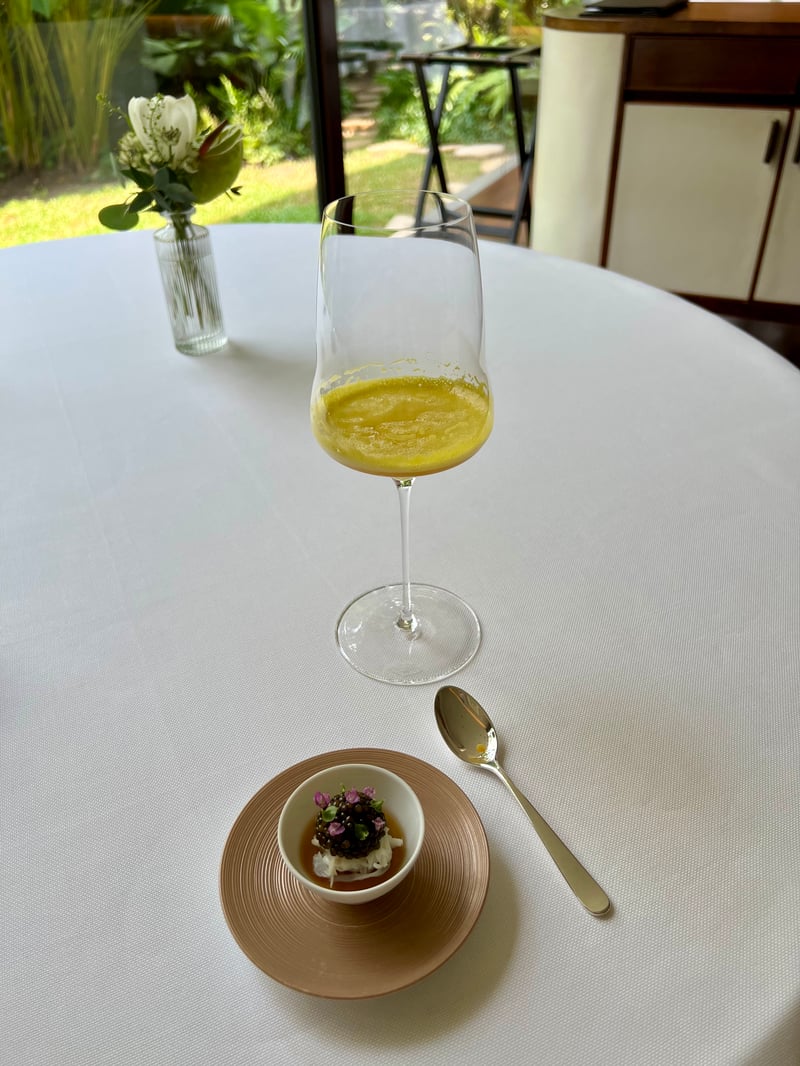 We then opted for a non-alcoholic pairing, just as inventive. The first glass, a kombucha of mint, turmeric, quince and dill, accompanied a delicate dish of king crab and caviar. The sweet crab meat combined with the briny caviar in a subtly balanced composition, rounded out with a creamy sauce and adorned with edible flowers — a plate as refined visually as it was in taste.