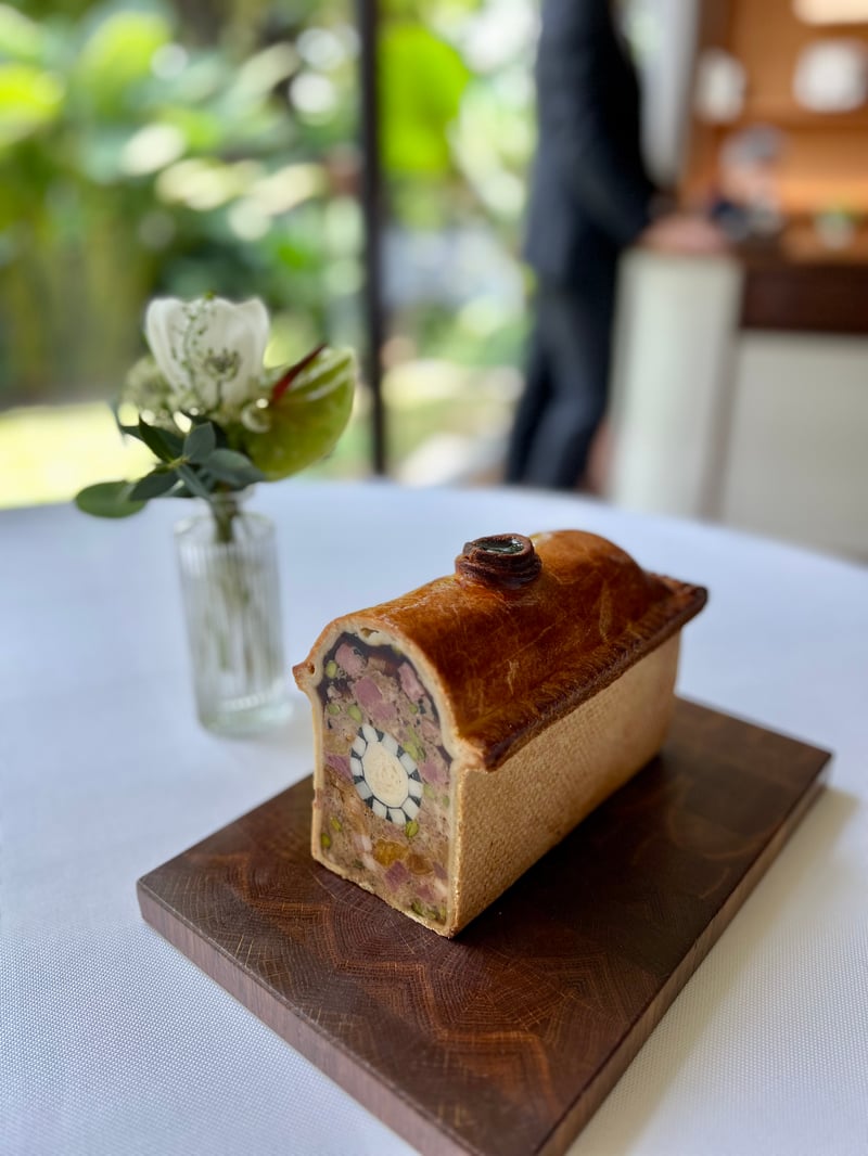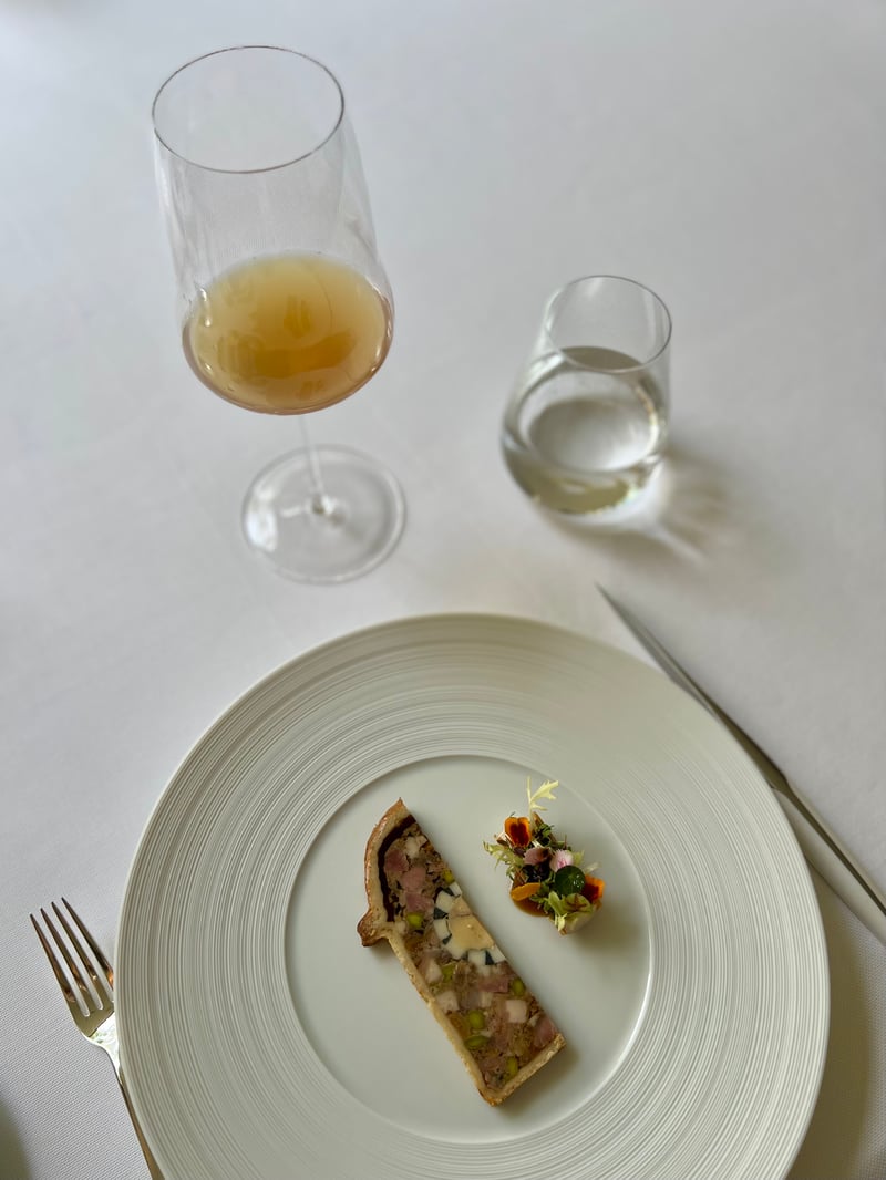 We continued with a superbly executed game pâté en croûte. Inclusions of fresh parsley and pistachios added freshness, crunch, and aromatic complexity. The presentation, enhanced with young shoots and edible flowers, was paired with a jus made from Elstar apple, spiced with nutmeg, infused with vanilla and structured with a note of barley — evoking a gentle fermentation or natural maceration. A pairing full of character.