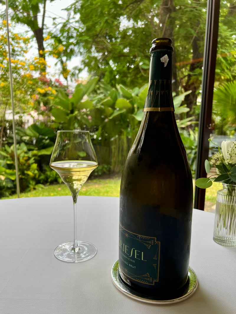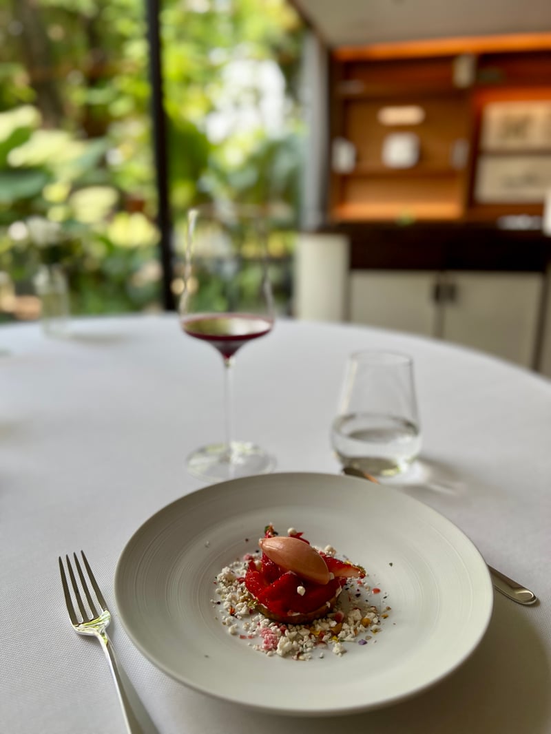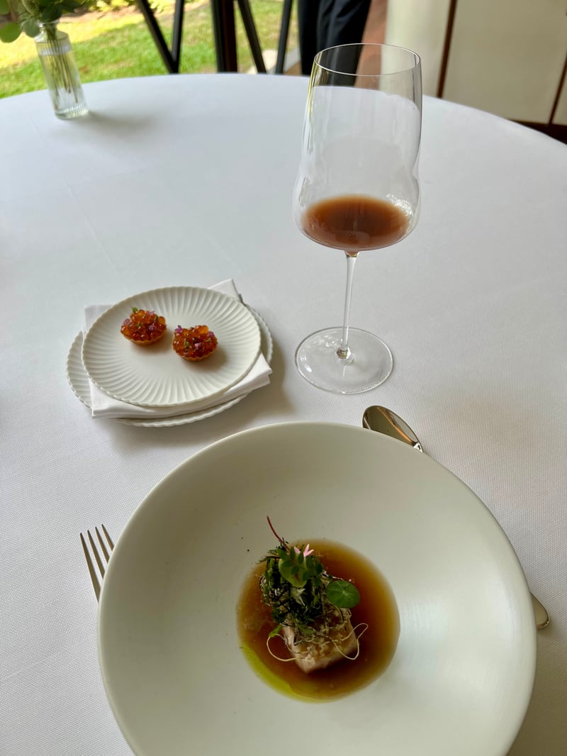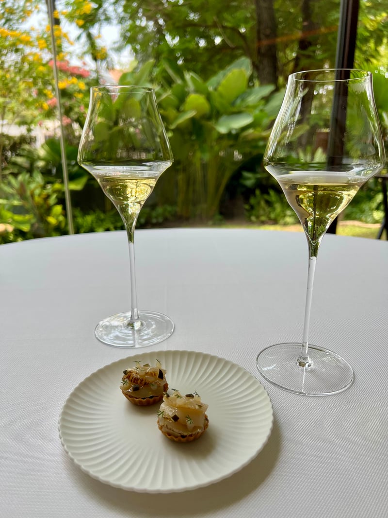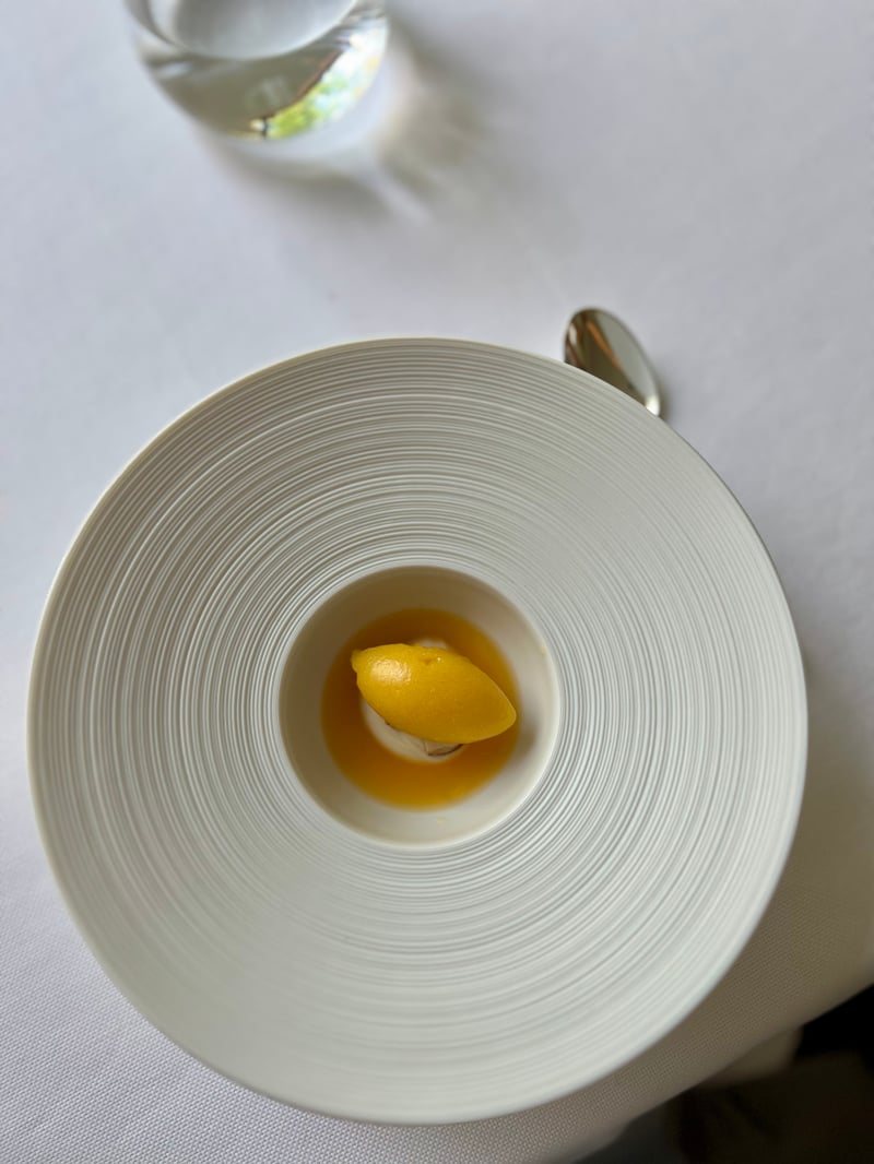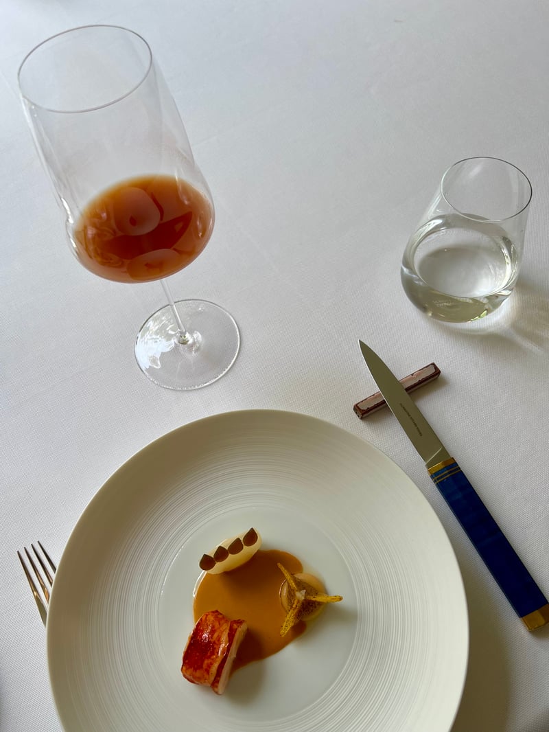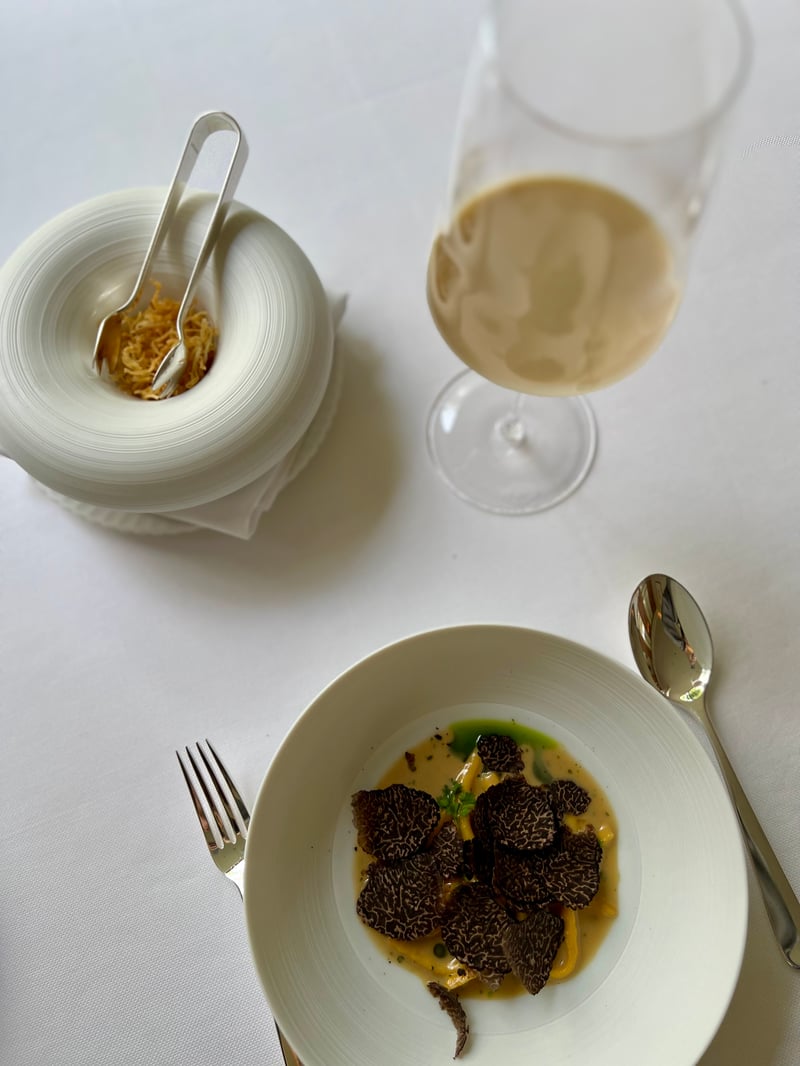 We began the tasting menu with a glass of Riesling Brut from German house Griesel & Compagnie. This wine delights with its lively freshness, fine bubbles, and elegant citrus and white fruit aromas — a light and airy opening to accompany the first bites. The first amuse-bouche, as elegant as it was delicately plated, paired the sweetness of leek with the aromatic intensity of truffle, all elevated by a sculptural presentation worthy of a work of art. Next came a fine tartlet combining the tenderness of scallop with the sweetness of pumpkin and the iodine notes of kelp, creating a subtle land-and-sea harmony.