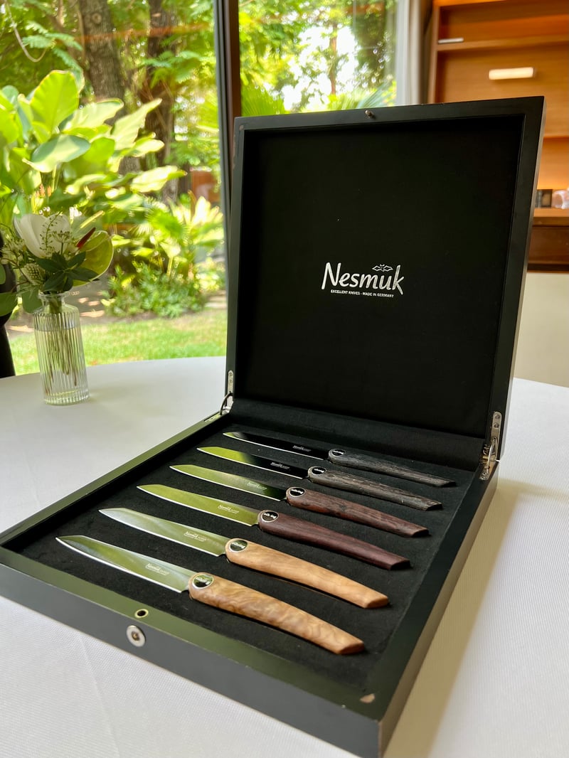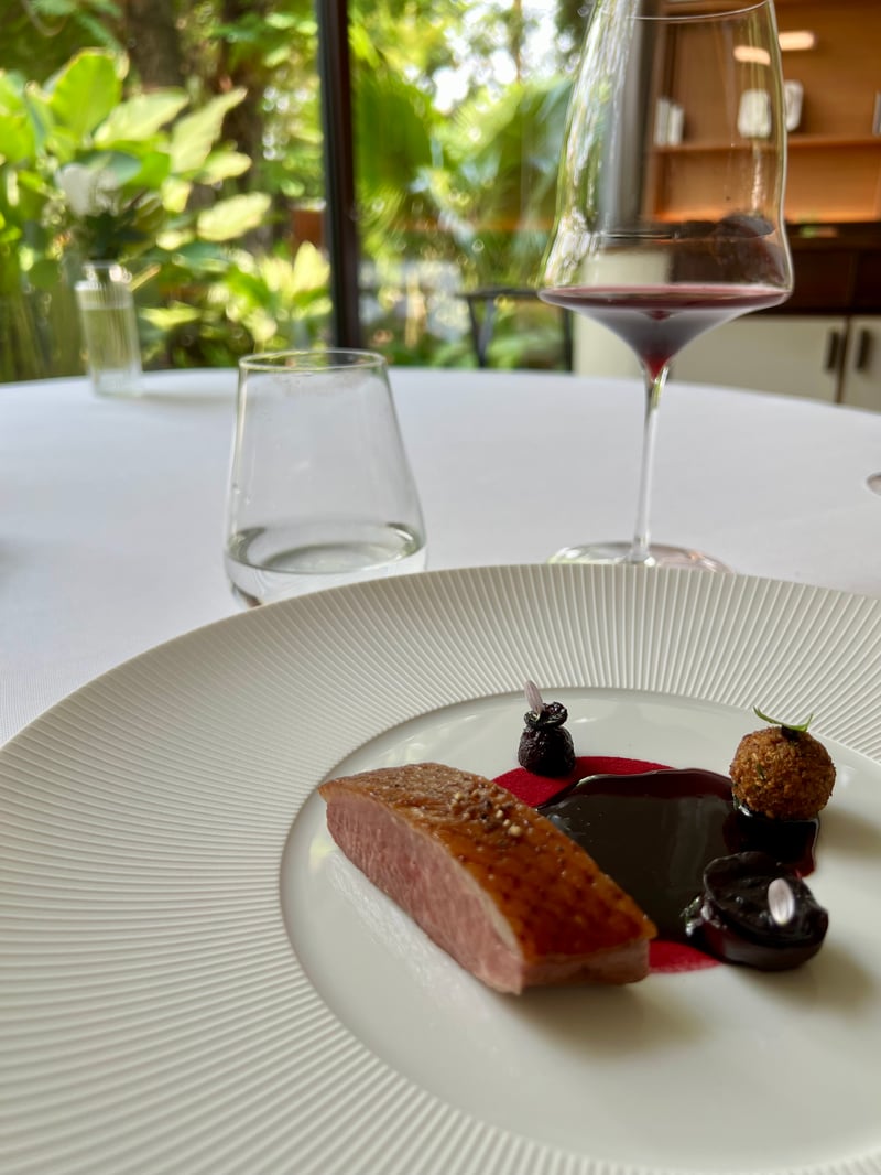 Roast duck was then presented in its cast-iron cocotte, still steaming atop a bed of thyme. This presentation moment stirred curiosity before the precise carving. We could also choose our knife from a selection of exceptional pieces with German blades and fine wooden handles. The aged and perfectly roasted duck breast revealed juicy meat beneath a crispy skin. It was served with a medley of beetroot, cherry and coffee textures: intense purée, glossy sauce, confit elements, pearls or gel, and a crunchy croquette. The deep-red jus combined Pinot Noir, hibiscus, pepper and cinnamon — a rich, complex and refreshing marriage that enhanced the depth of the dish.