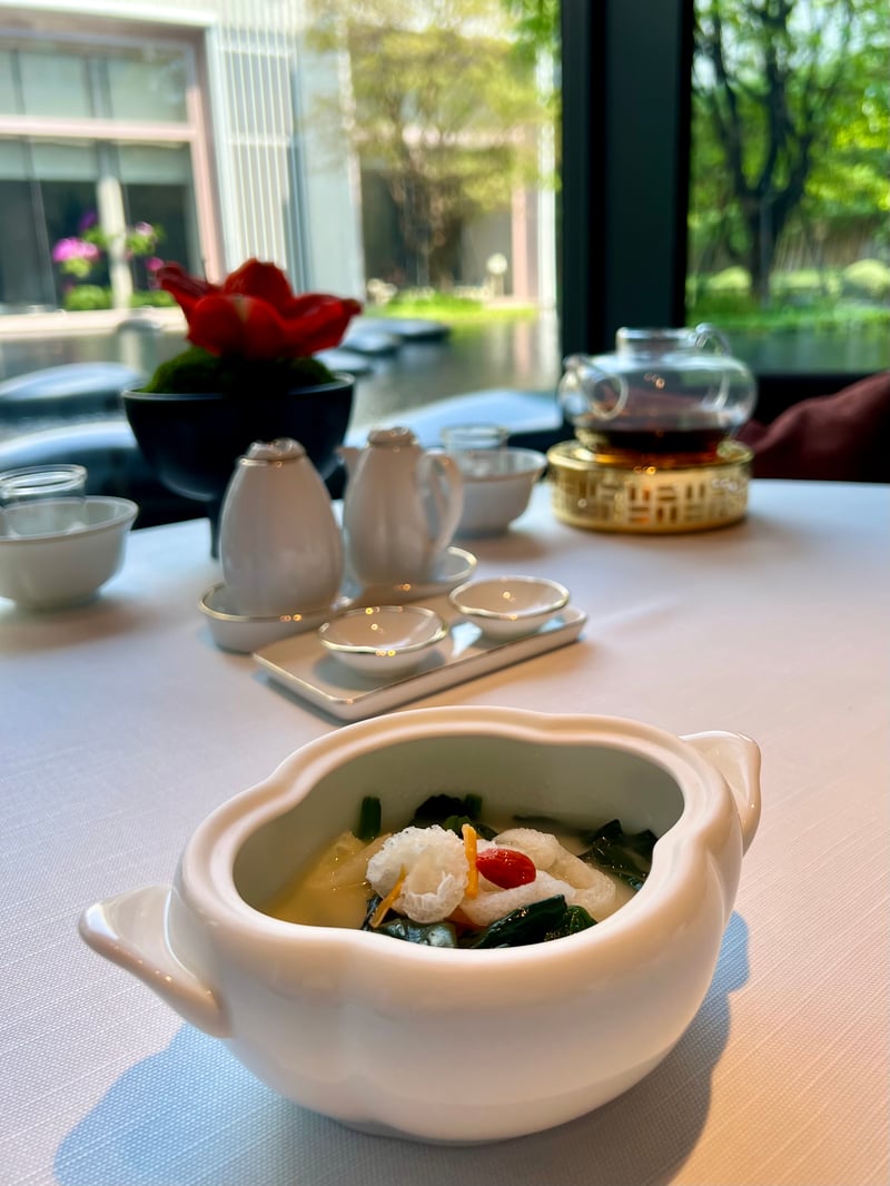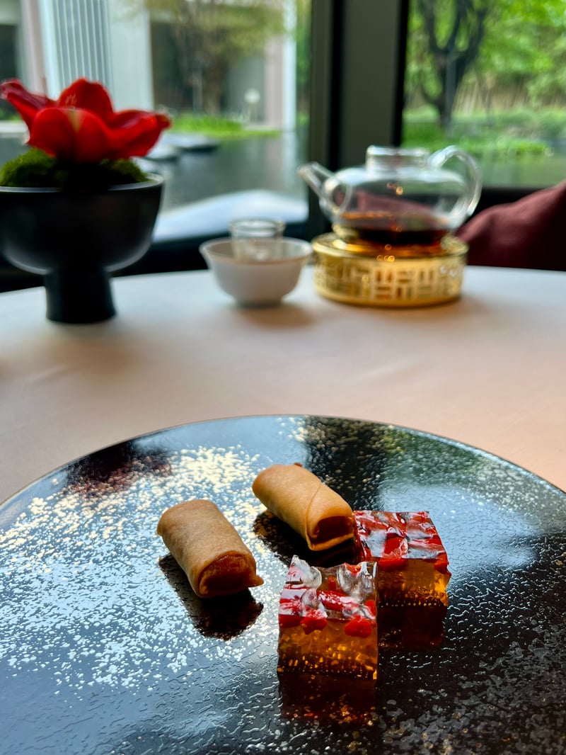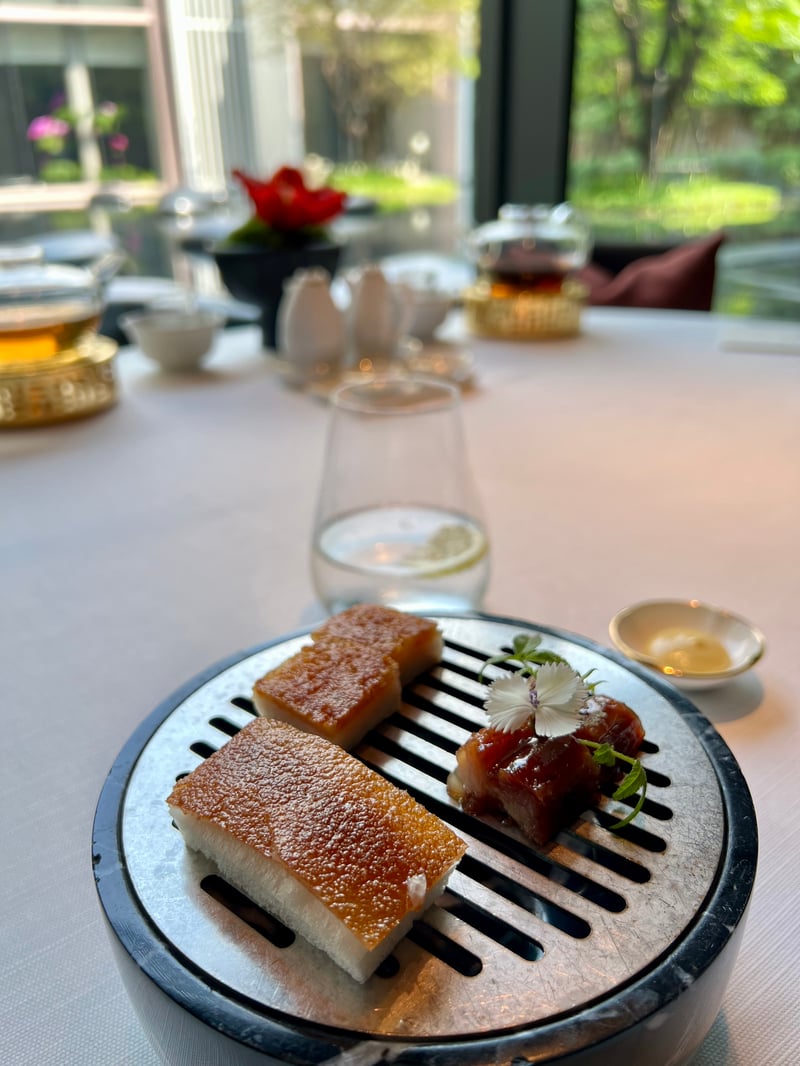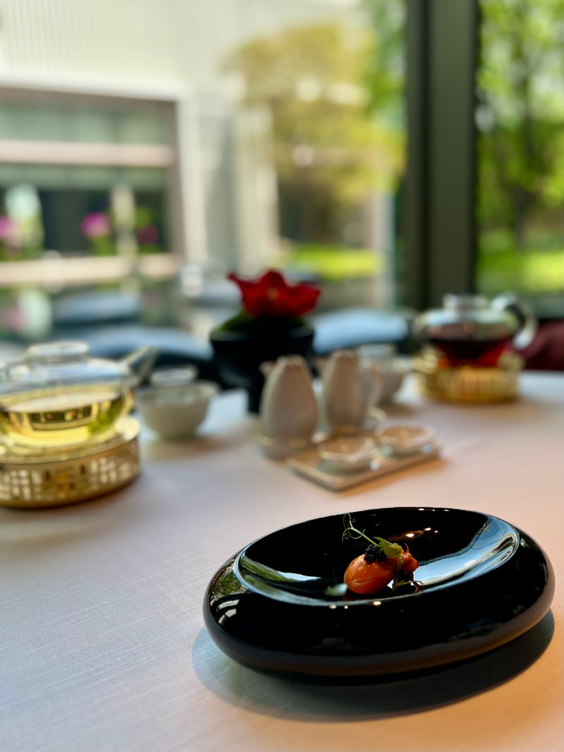 Our lunch at Yu Ting Yuan was a remarkable culinary experience, marked by the elegance and creativity of Chef Tommy Cheung. On this sunny day in February, our arrival at this exceptional establishment immediately immersed us in an atmosphere of serenity, accentuated by the view of the water mirror stretching out in front of our elegantly set table. The presentation of each dish, starting with an amuse-bouche artistically arranged on a plate evoking the surrounding pebbles, immediately set the tone for an exceptional meal.