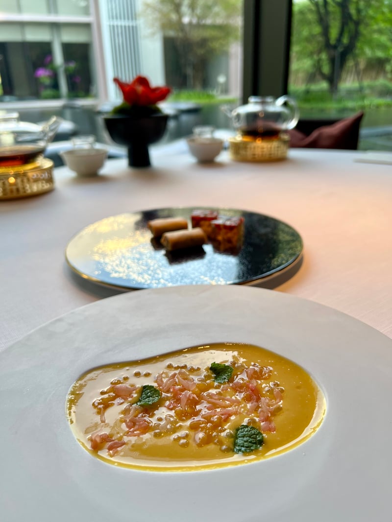 The chef introduced his signature dishes in Bangkok with a seven-course Cantonese menu that is all the rage at dinner time. We opted for the dim sum lunch menu, which was a real treat. The dim sums, introduced first, were a revelation of flavors and textures. Between the steamed ones of incredible tenderness and the fried ones, of rare elegance, each bite was delicious, with remarkable creations like the sweet potato swan and the fish and pandan dim sum, evidence of a successful fusion between Cantonese techniques and Thai touches.