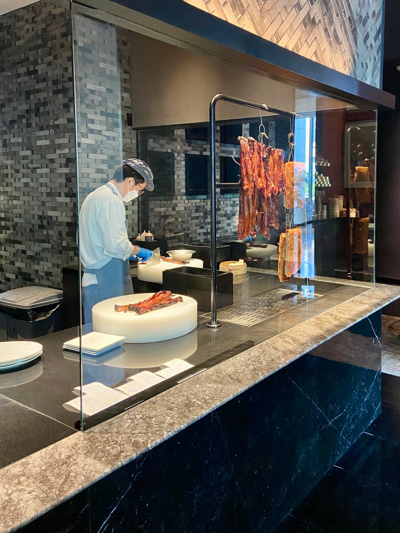 The interior of the restaurant is a true homage to elegance with its architectural elements inspired by Chinese tradition, revisited in a contemporary way, luxurious chandeliers, and modern art pieces that captivate the gaze. The culinary experience is completed by the sight of carefully hung Peking ducks in a glass-enclosed open kitchen, ready to be prepared by flame, promising an immersion into Cantonese culinary art.
