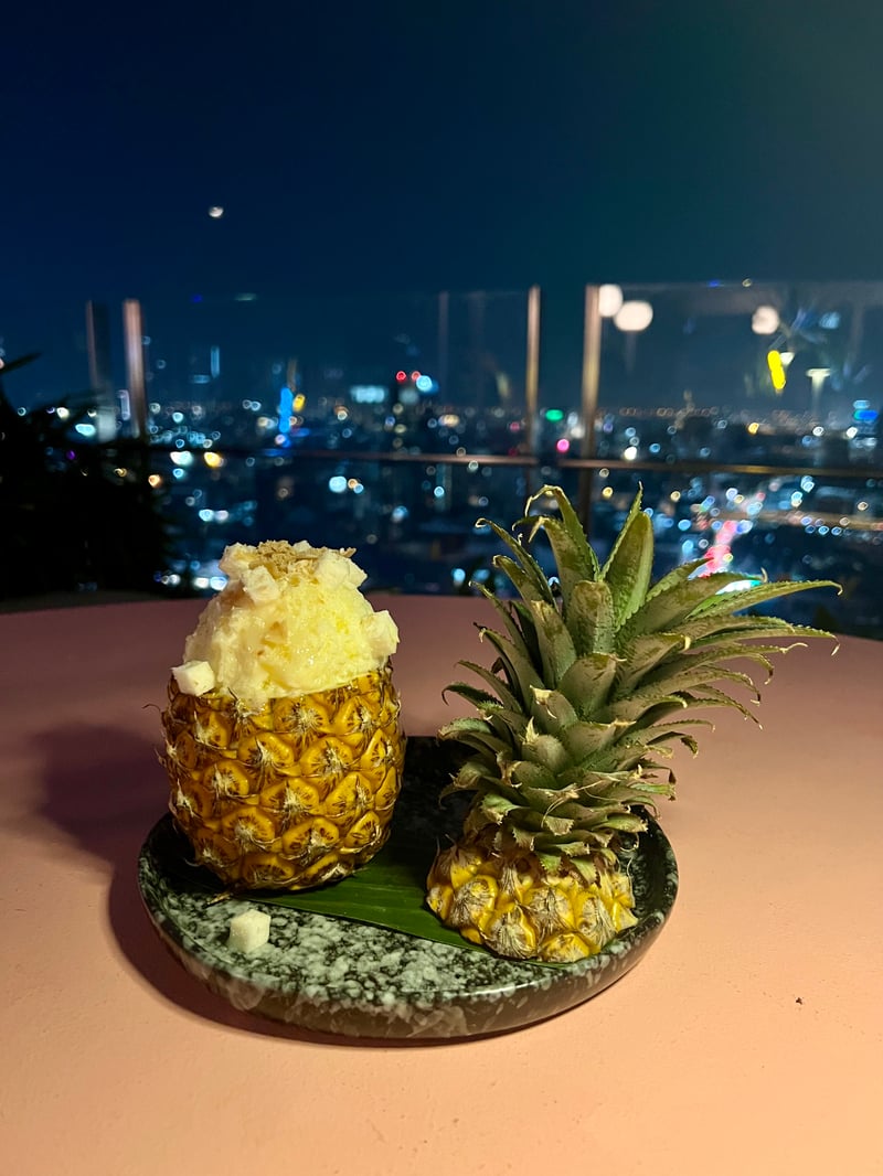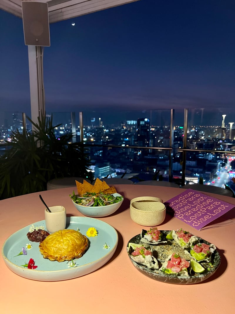 We began our evening with a Dearless Hoopoe mocktail for my husband (a subtle mix of Rooibos red tea, passionfruit-mint, aquafaba, and lemon) and a Death from Above cocktail for me (a bold creation featuring tequila, passionfruit syrup and ginger, lime, sparkling wine, and pineapple juice). All accompanied by an unforgettable spectacle: the sun setting over Bangkok's vibrant metropolis.