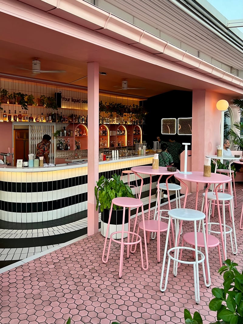The design, conceived by the Australian creative agency MASH, celebrates the color pink in all its forms. From the floors to the furniture, utensils, and bar, this omnipresent hue creates a dreamlike and joyfully surreal atmosphere. Every detail seems designed to surprise and inspire, down to the arrangement of spaces, where circular banquettes and daybeds allow guests to enjoy stunning views of the sunset and Bangkok's skyline. This immersive aesthetic, combined with multi-level architecture, invites visitors to explore and lose themselves in this unique universe.