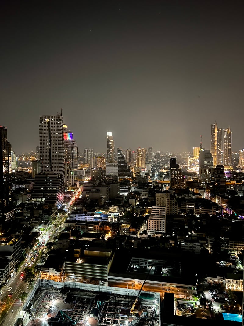 Scarlett Wine Bar and Restaurant captivates with its elegant and sophisticated atmosphere, where every detail is designed to offer a refined yet friendly experience. Located on the 37th floor of the Pullman Bangkok Hotel G, this essential Bangkok rooftop skillfully blends contemporary design with vintage touches, featuring leather sofas, large wooden tables, and a modern bar. The indoor space, adorned with panoramic bay windows, is bathed in subdued light that highlights the elegance of the decor. The terrace, a true green haven above the city, offers a stunning view of the sparkling skyline and the Chao Phraya, ideal for a dinner or a cocktail at sunset.