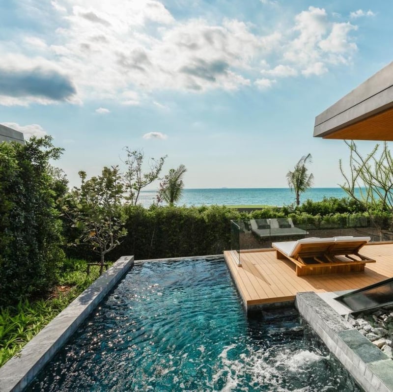 Blocky minimalist pavilions built from local Thai granite and polished wood pay tribute to the region's stone-carving heritage while framing Pattaya Bay through wraparound glass. Each of the 35 rooms opens onto a private pool; days drift between the beachfront espresso bar, sunset cocktails, and an activity roster that includes Muay Thai boxing and tattoo body painting alongside kayaking and paddleboarding.