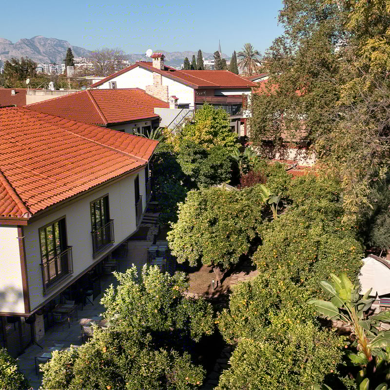 Kaleiçi, the walled old town, contains restored Ottoman mansions converted into intimate properties. Narrow lanes wind past Byzantine-era towers, ancient mosques, and the fluted minaret of Yivli Minare. The harbor and Hadrian's Gate are steps away, and the neighborhood maintains an authentic residential character despite its popularity with visitors.